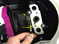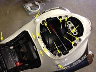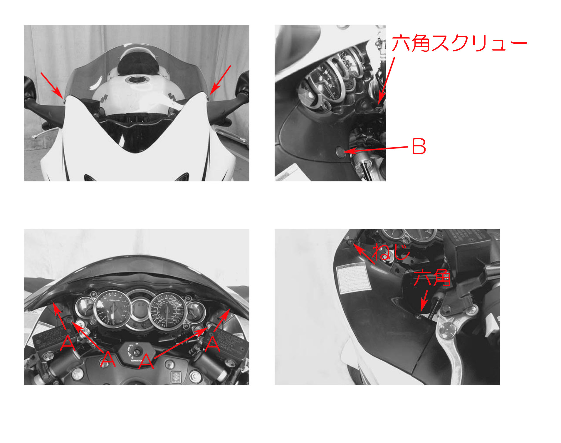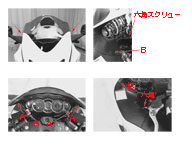 3. ミラーの付け根裏側にあるタイプAファスナー左右、エアダクト上部カバーの連結部ファスナーを取り外し、メーター上部カバーを取り外す。 上部カバーは奥部にあるカバーとフックで止まっているので、旨いこと取り外す。