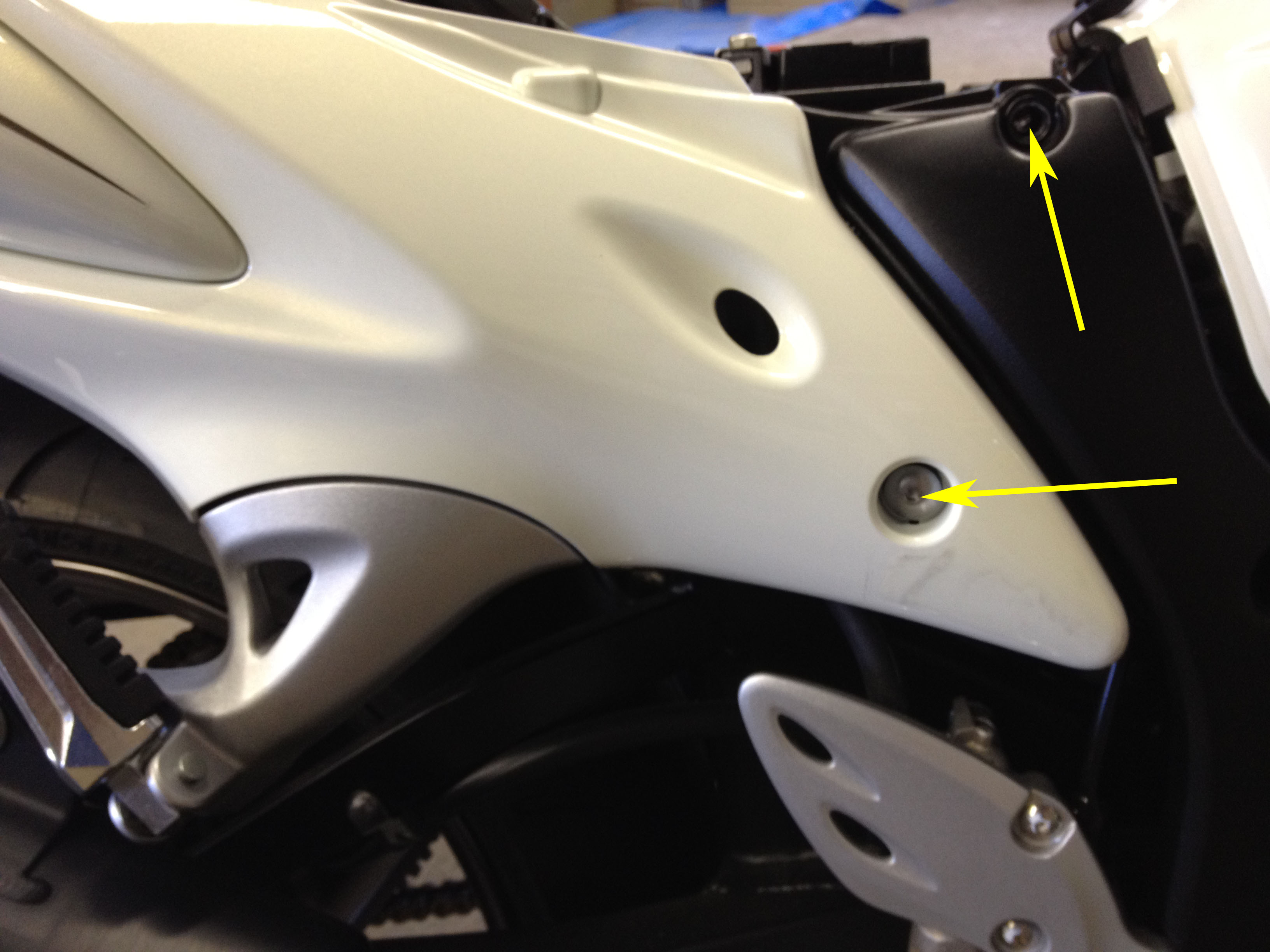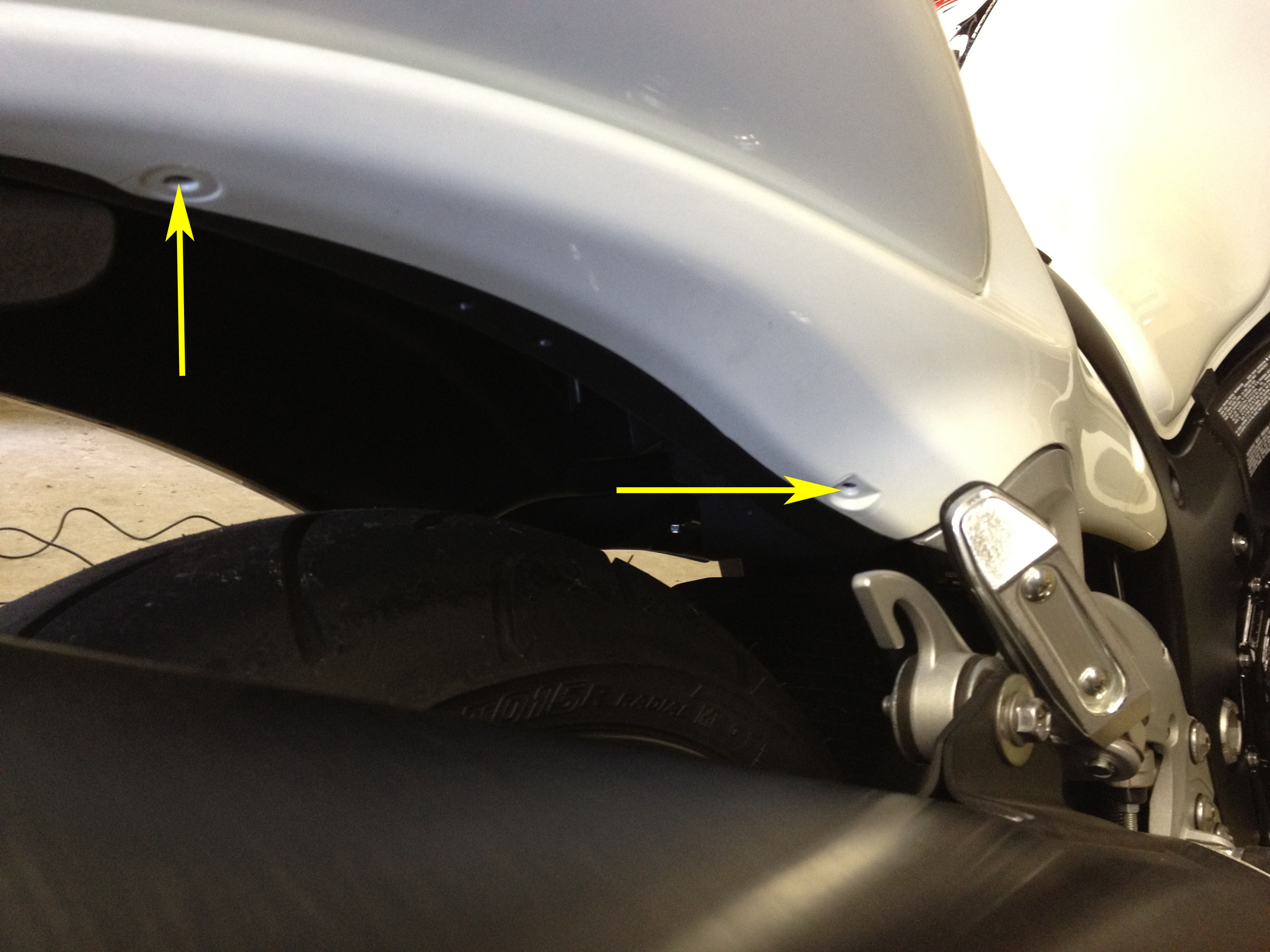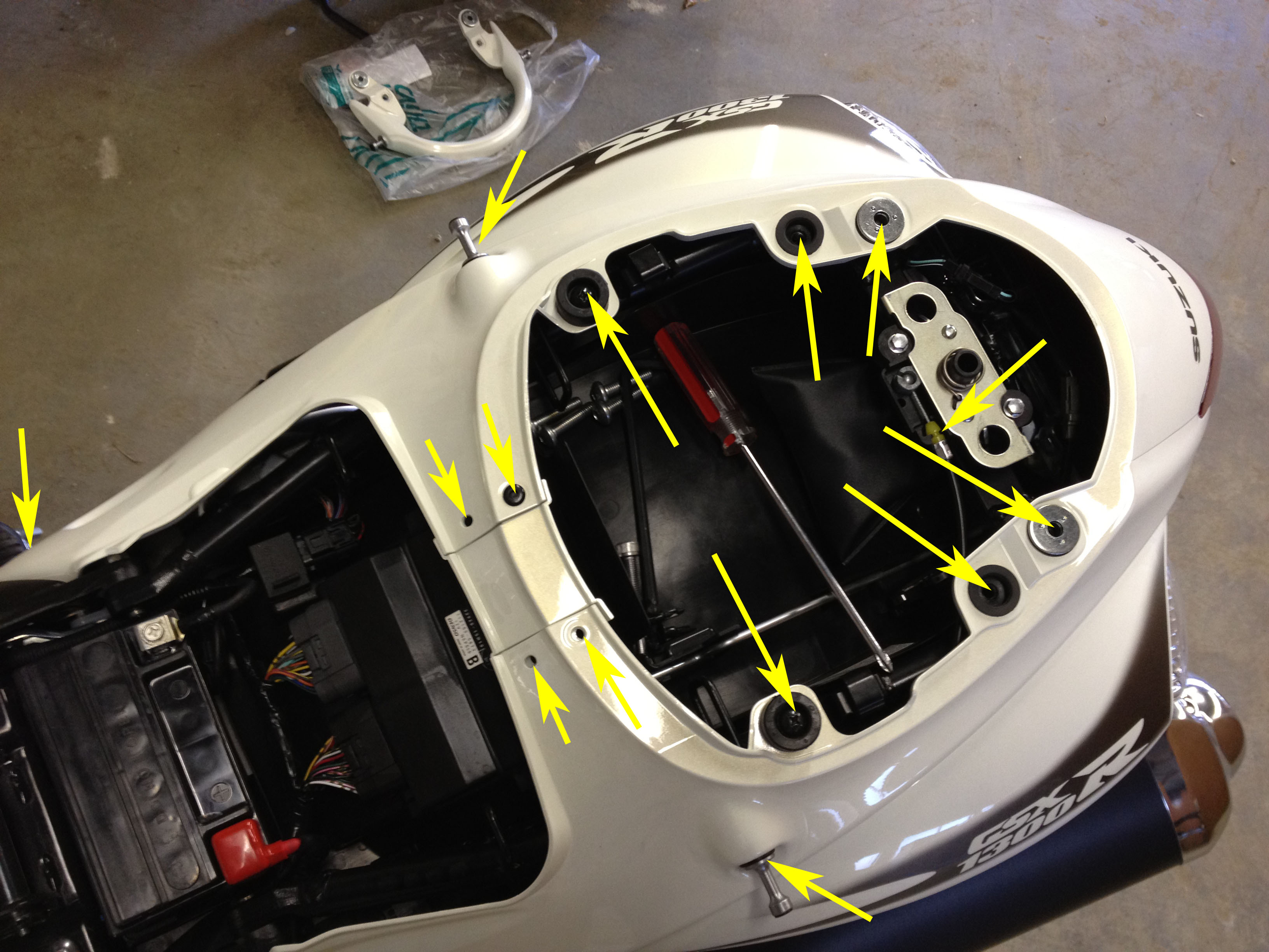 リアカウルの取り外し。 シート止めビス2本、六角6本、プラスねじ2本、荷紐掛け2本、ファスナー6個を外す必要がある。