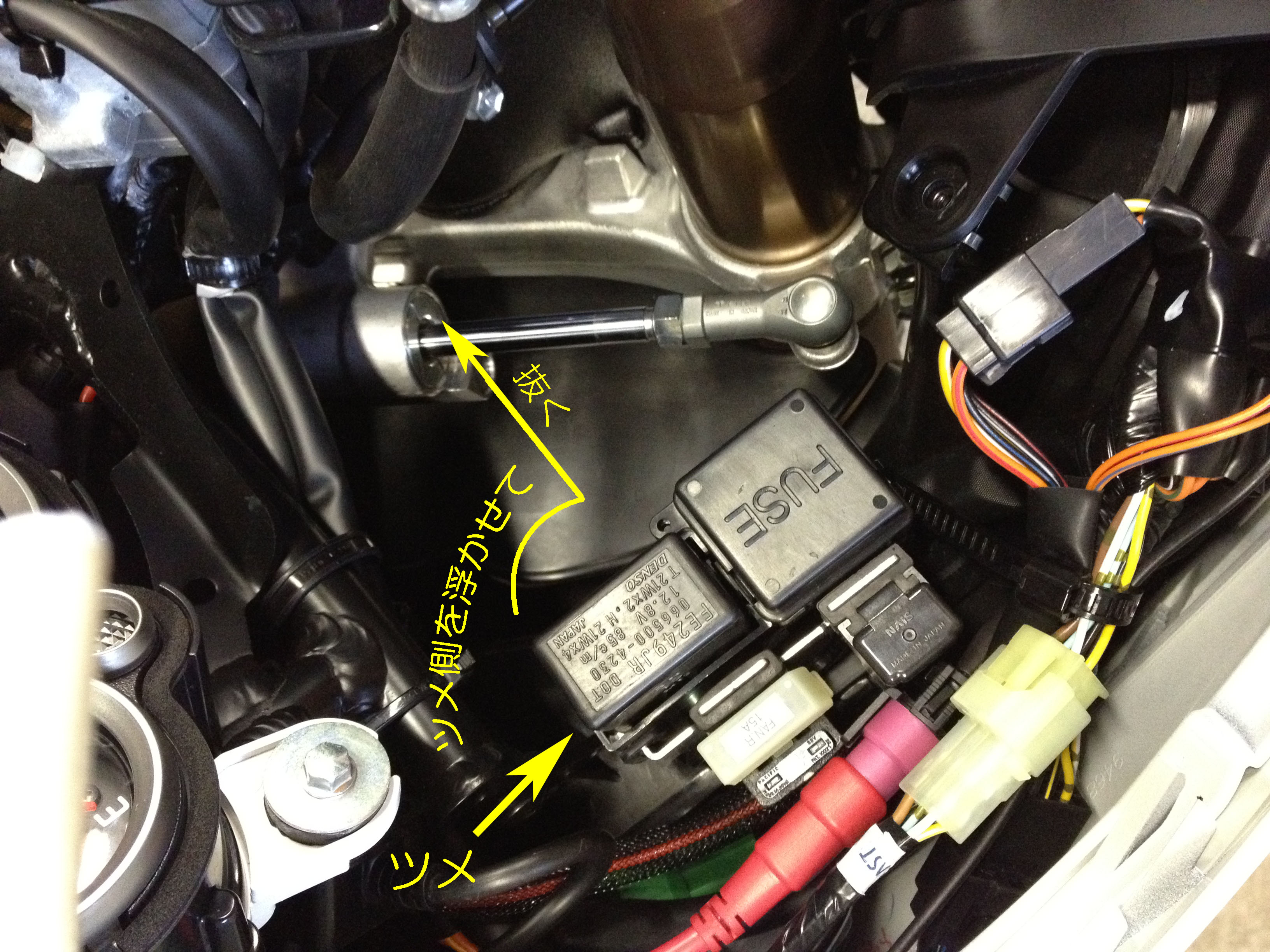 ウインカーリレーの取り外し。 フロント側にロックが付いているので、マイナスドライバーで浮かせて、手前に一度少し斜めにリレーを起こし、取り外す。