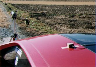 赤外線送信機は送出窓を縦にしてスタートラインに設置します。