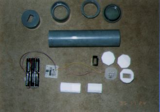 回路図中には記してありませんが、PIC16C57, MSM6237, LM1881, 74HCT04 の電源ラインに0.1μF程度のパスンを入れておいて下さい。 さもないと、保証付きで誤動作します。 ;(^^) 赤外線送信部は防水性能が重要であるので、VU管と言ういわゆる排水管を使ってケースを作ります。