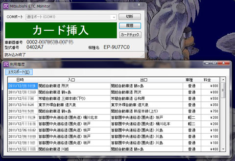 [更新履歴] 2012.1.5 初版 2012.1.18 料金所番号ファイルに首都高などが入っていなかったので第2版に追加 2012.3.31 料金所番号ファイル第3版 2013.4.13 [Ver1.01] 64bitOSで ODBCエラーが出るので、32bitで動作するようコンパイルしなおした。 COMポートが空白のままだとエラーで落ちるのを警告表示するようにした。 2013.4.16 料金所番号ファイル第4版 2013.10.31 料金所番号ファイル第5版 2014.10.17 料金所番号ファイル第6版 2015.3.1 料金所番号ファイル第7版 2015.9.25 料金所番号ファイル第8版 2016.8.14 料金所番号ファイル第9版 2017.2.7 料金所番号ファイル第10版 2017.6.17 [Ver1.02] ODBCを使用しないようにした。.net Framework 4.6対応に変更した。 USBシリアルの種類によっては正しく通信できないことがあるのを修正した。 表示フォントを Meiryo UIに変更した。登録日取得コマンドの実装が無いモデルに 対応した。 9U812V型で新発見したコマンドを掲載。 履歴レスポンスの日付が秒の項目を追加 2017.9.6 料金所番号ファイル第11版 2018.9.12 料金所番号ファイル第12版 2019.4.28 料金所番号ファイル第13版 2020.1.29 料金所番号ファイル第14版 2020.5.7 料金所番号ファイル第15版 2020.11.20 料金所番号ファイル第16版 2021.4.14 検証機種追加(EP-9U716V) 2021.5.7 料金所番号ファイル第17版 2021.11.26 料金所番号ファイル第18版 2022.3.2 料金所番号ファイル第19版 2022.6.26 料金所番号ファイル第20版 2022.11.14 料金所番号ファイル第21版 2023.5.11 料金所番号ファイル第22版 2023.11.21 料金所番号ファイル第23版 2024.4.22 料金所番号ファイル第24版 2024.11.22 料金所番号ファイル第25版 2025.4.15 料金所番号ファイル第26版 2025.10.28 料金所番号ファイル第27版