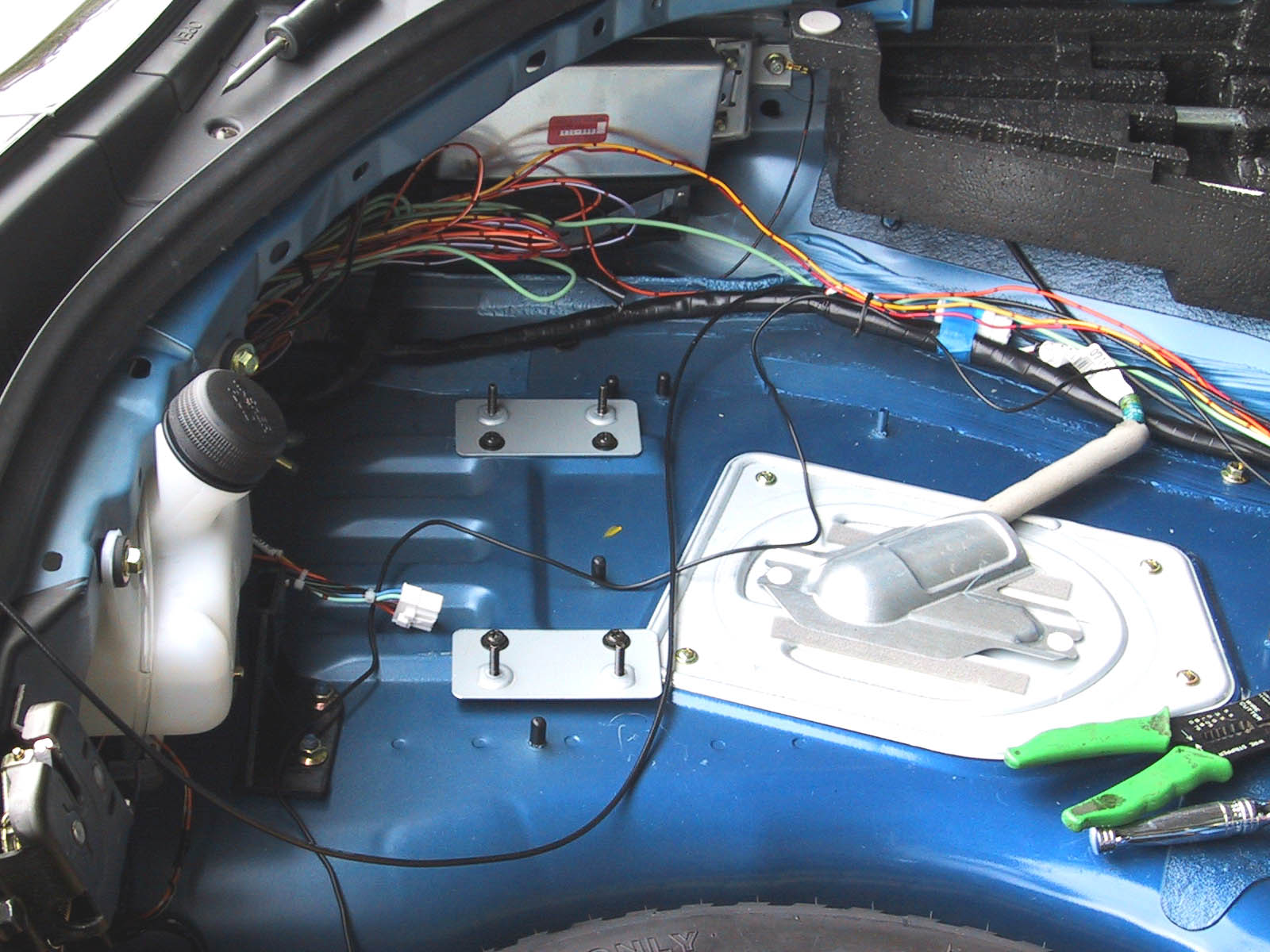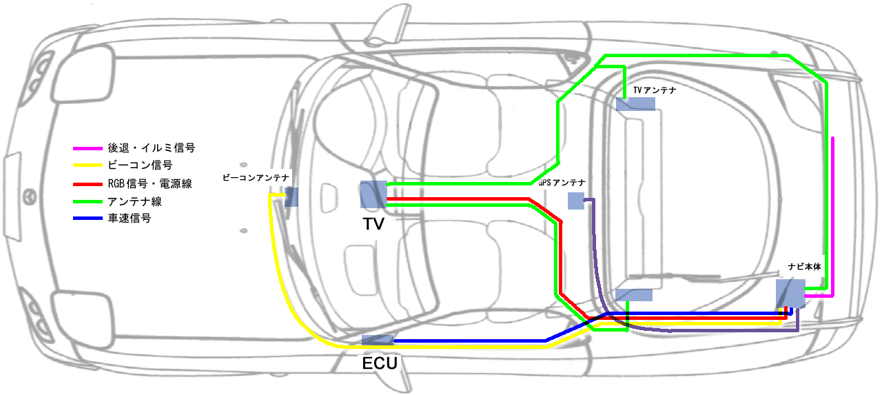GPS線はトランク左側カバーの内側からナビへ、ビーコン線は、ダッシュボードとフロントガラスの隙間から左側のECUの近くを通し、車速線と一緒にドア下側プレートの裏を通しナビ本体へ配線する。