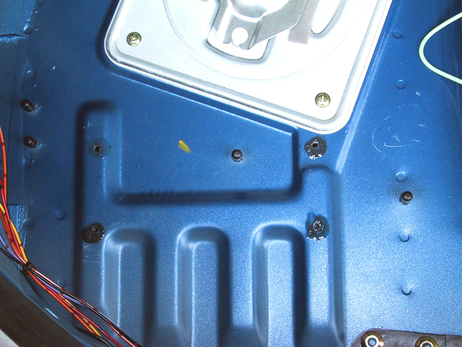 4.5φのキリで穴を開けるが、板金の反対側には燃料タンクがあって、3〜4センチ程しか隙間が無いので、タンクに傷を付けないように気を付けて穴をあける。