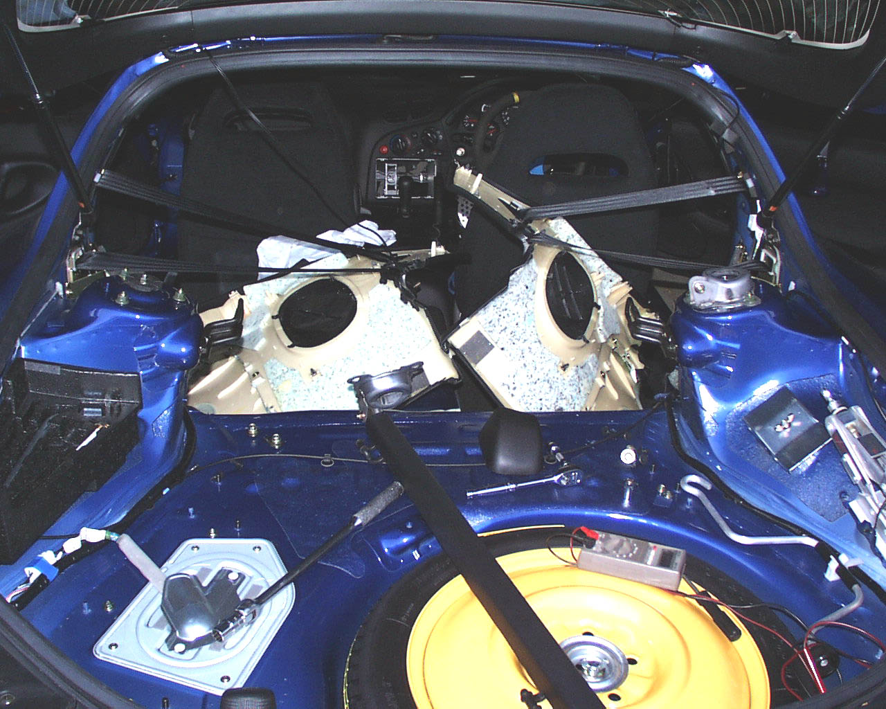 トランク、後部座席の内張りをすべてひっ剥がして、配線を取り回す。