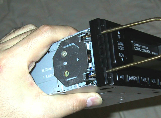 純正コンポは、両端の隠し蓋を取ると開いている穴へ棒を挿し、ロックを外して引き抜く。