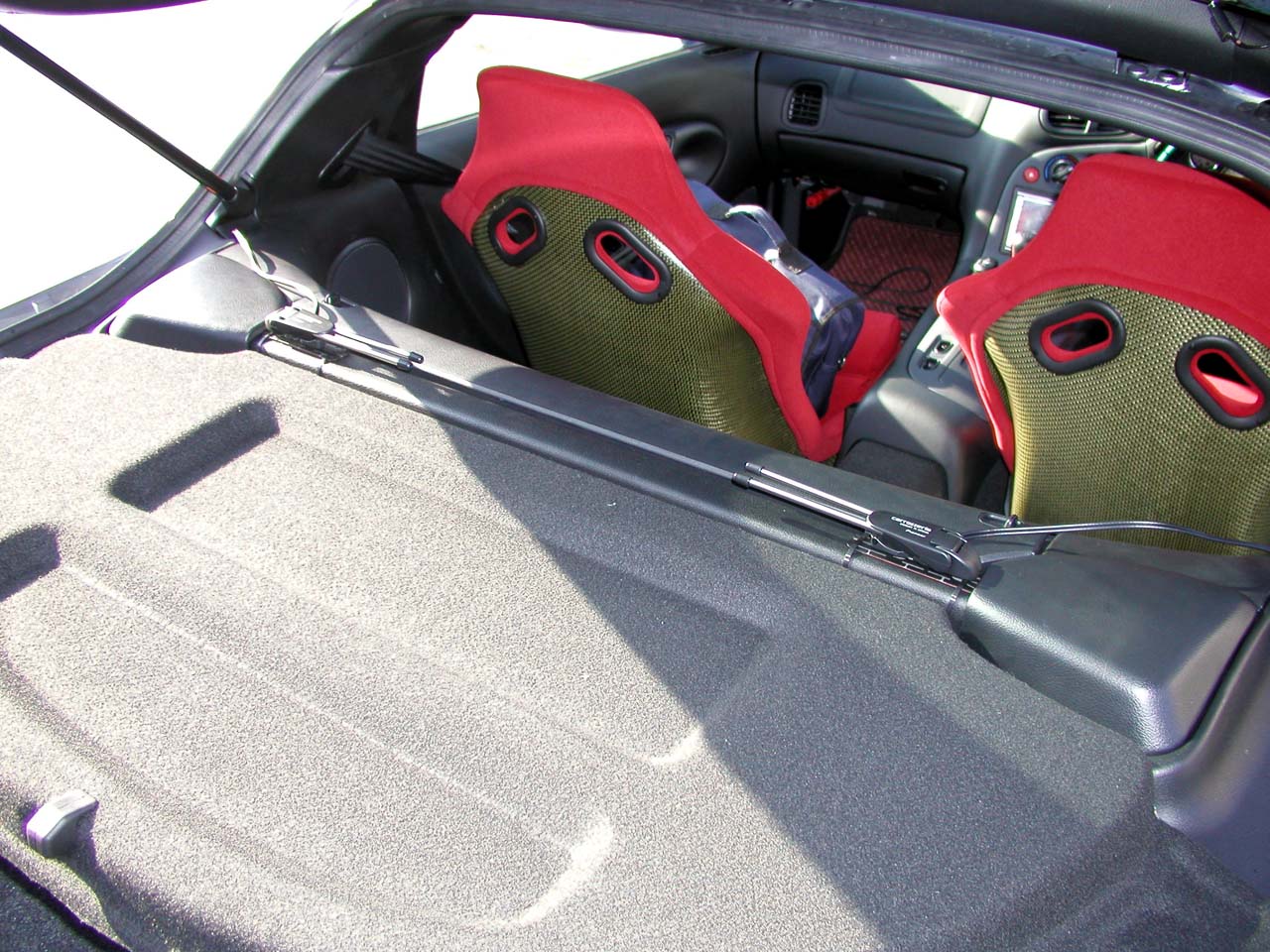 GPS、ビーコン、ETCはダッシュボード上、TVアンテナはリアのストラットタワーバーにくくりつけた。