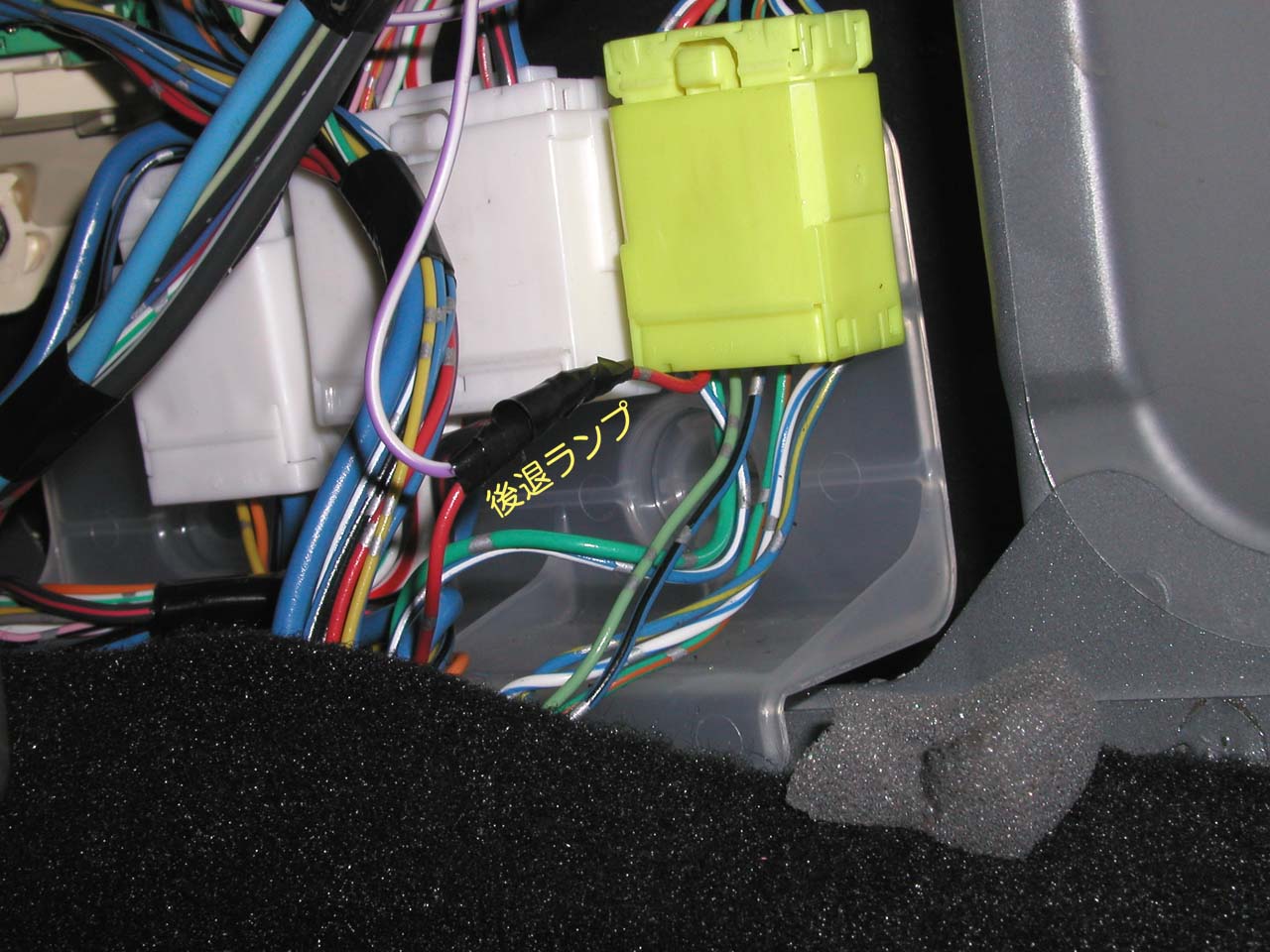 バックランプ信号は、運転席右足元のジャンクションの黄色いカプラーに来ているので、ここから取り出す。 コネクタ手前側列左から2番目の赤色の線である。