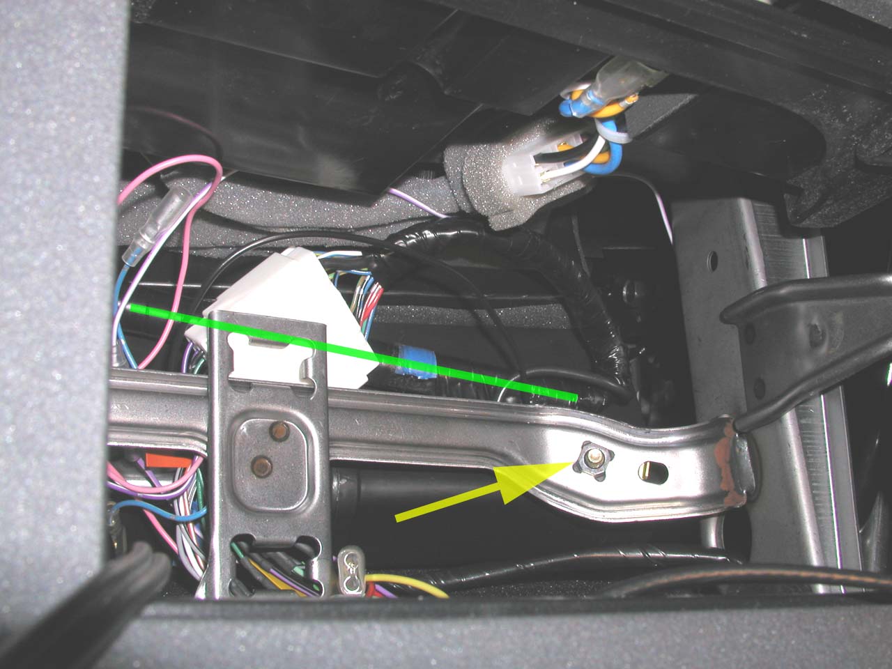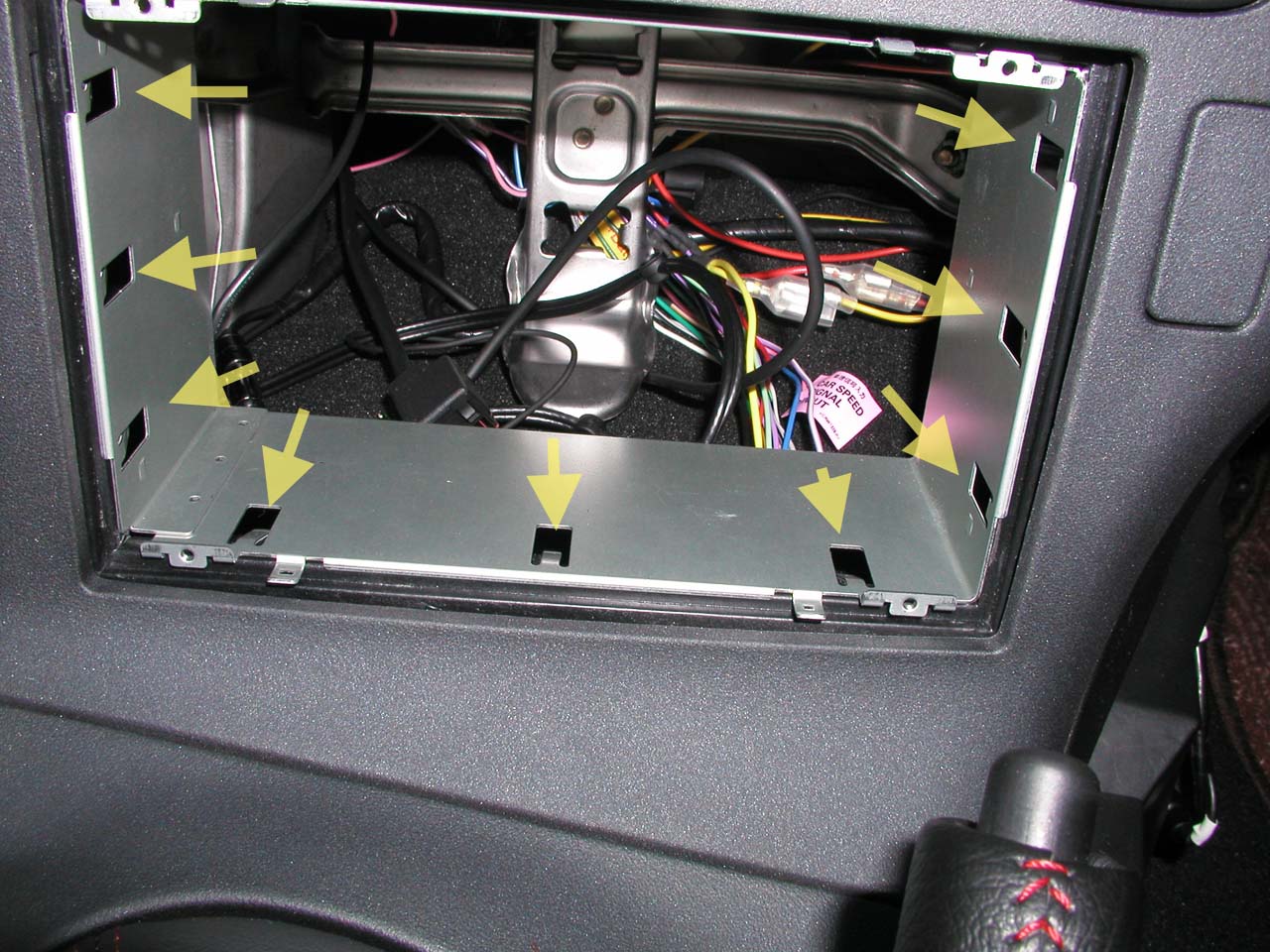 オーディオのハーネスはダッシュボードの奥から堅いプラスチックの芯(ガイド)と一緒にテープ巻きになってコンソール裏まで届いているのだが、なにせコンソール裏は狭いため、ガイドの長さの誤差によっては、純正コンポを引き出す時、裏でハーネスがトグロを巻いて引き出せなくなるのである。 黄色の矢印はアース線が止まっているビスである。 なんたることか裏側から止まっている。