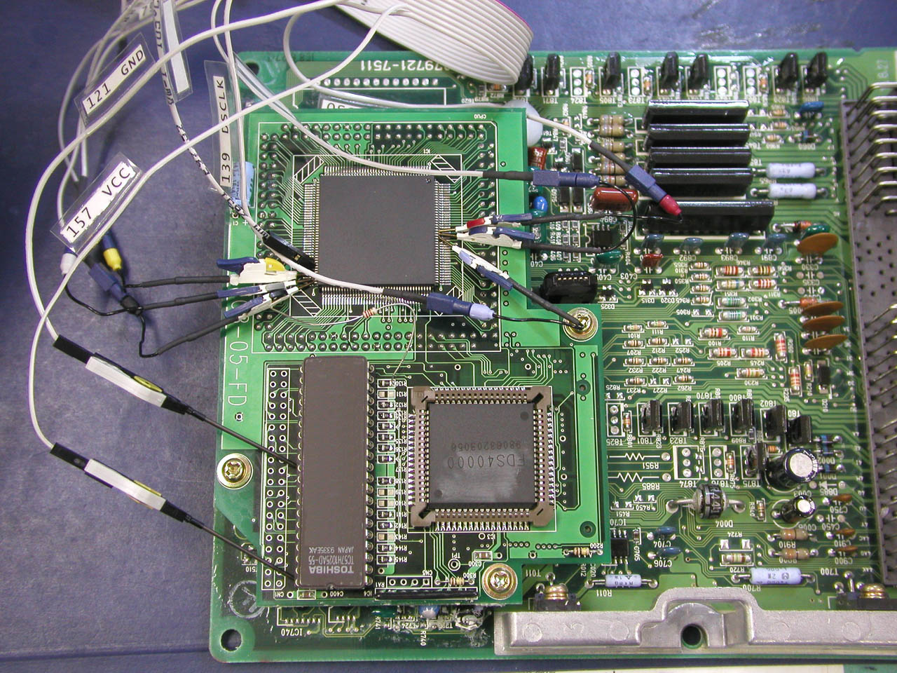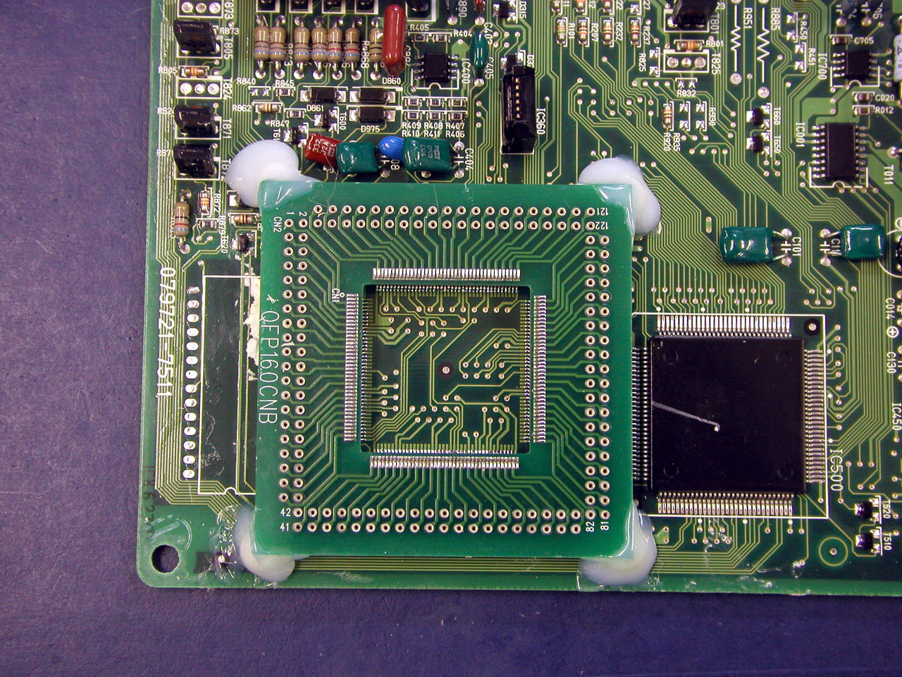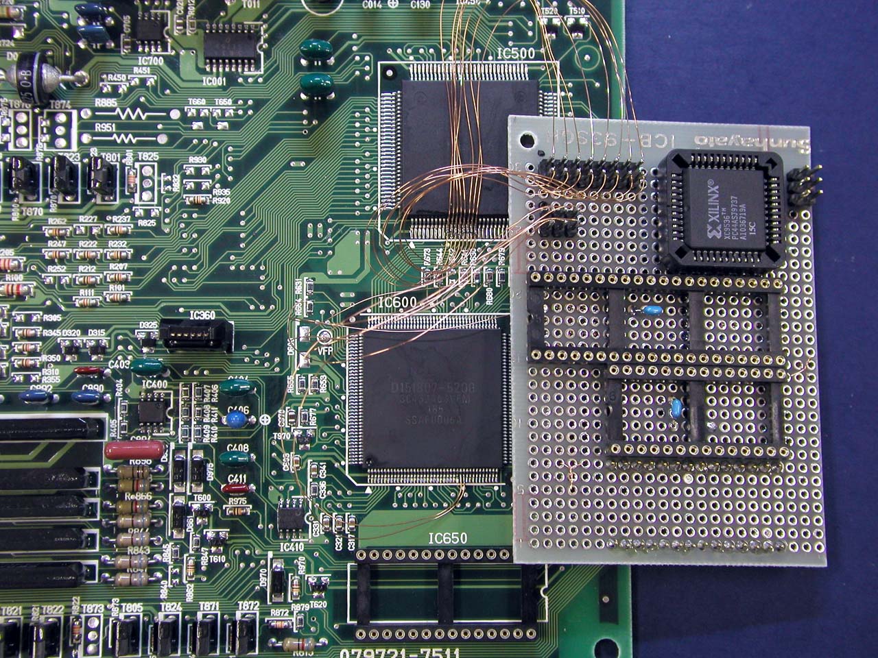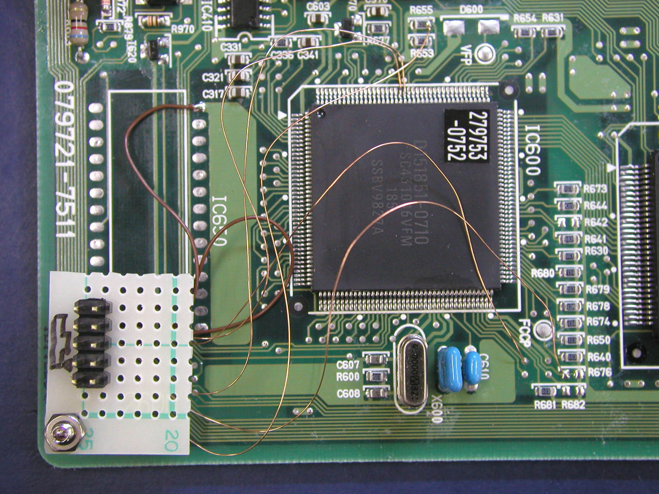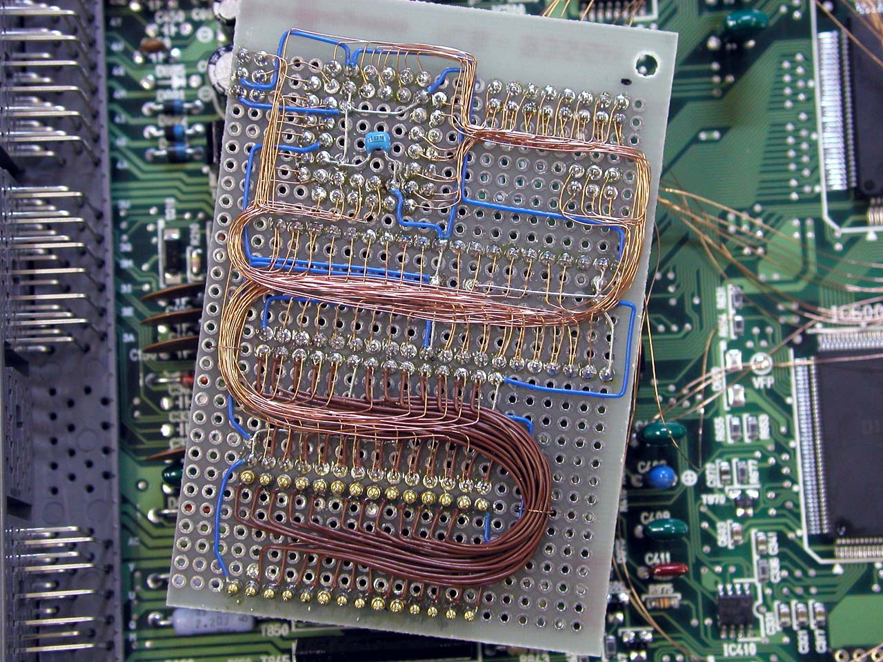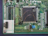 ![]() メイン基板との接続。QFPの足を跳ね上げて、基板側ピン側それぞれから配線を取り出す。 |