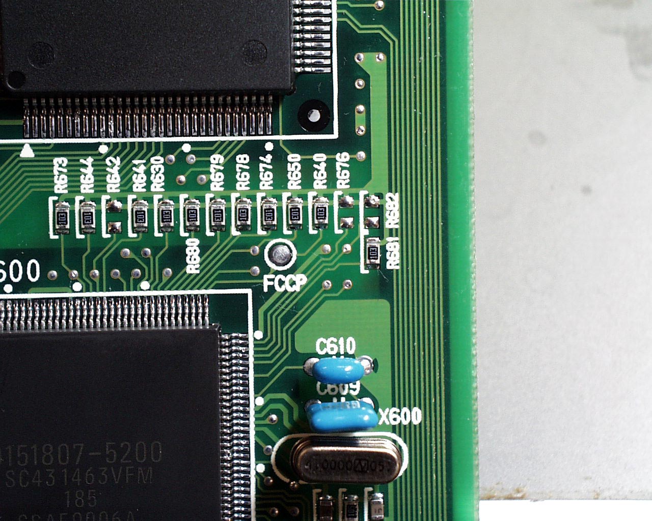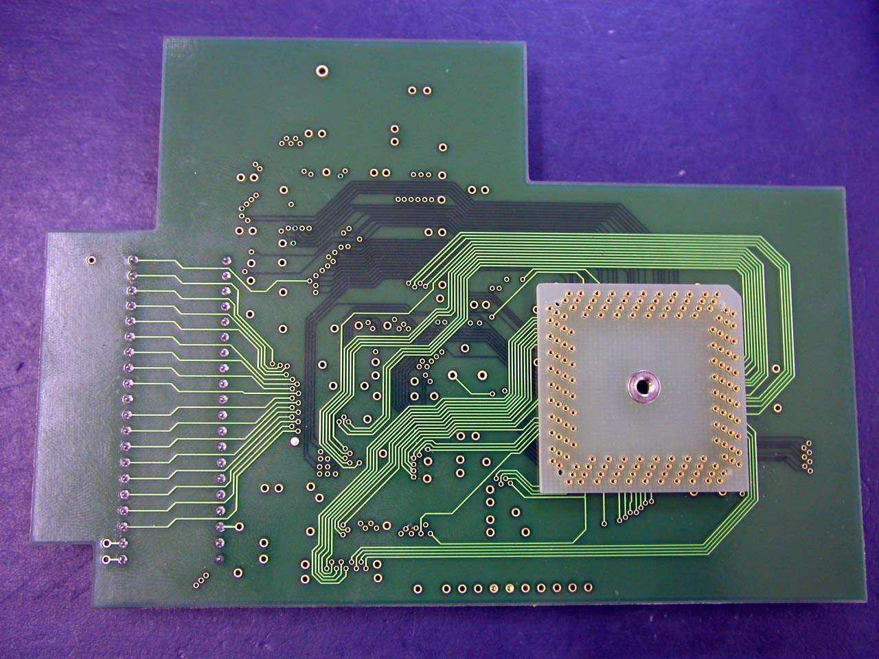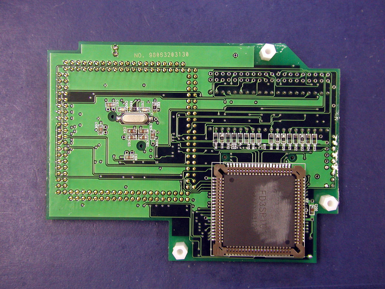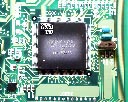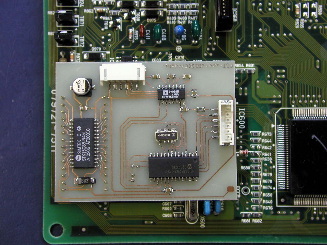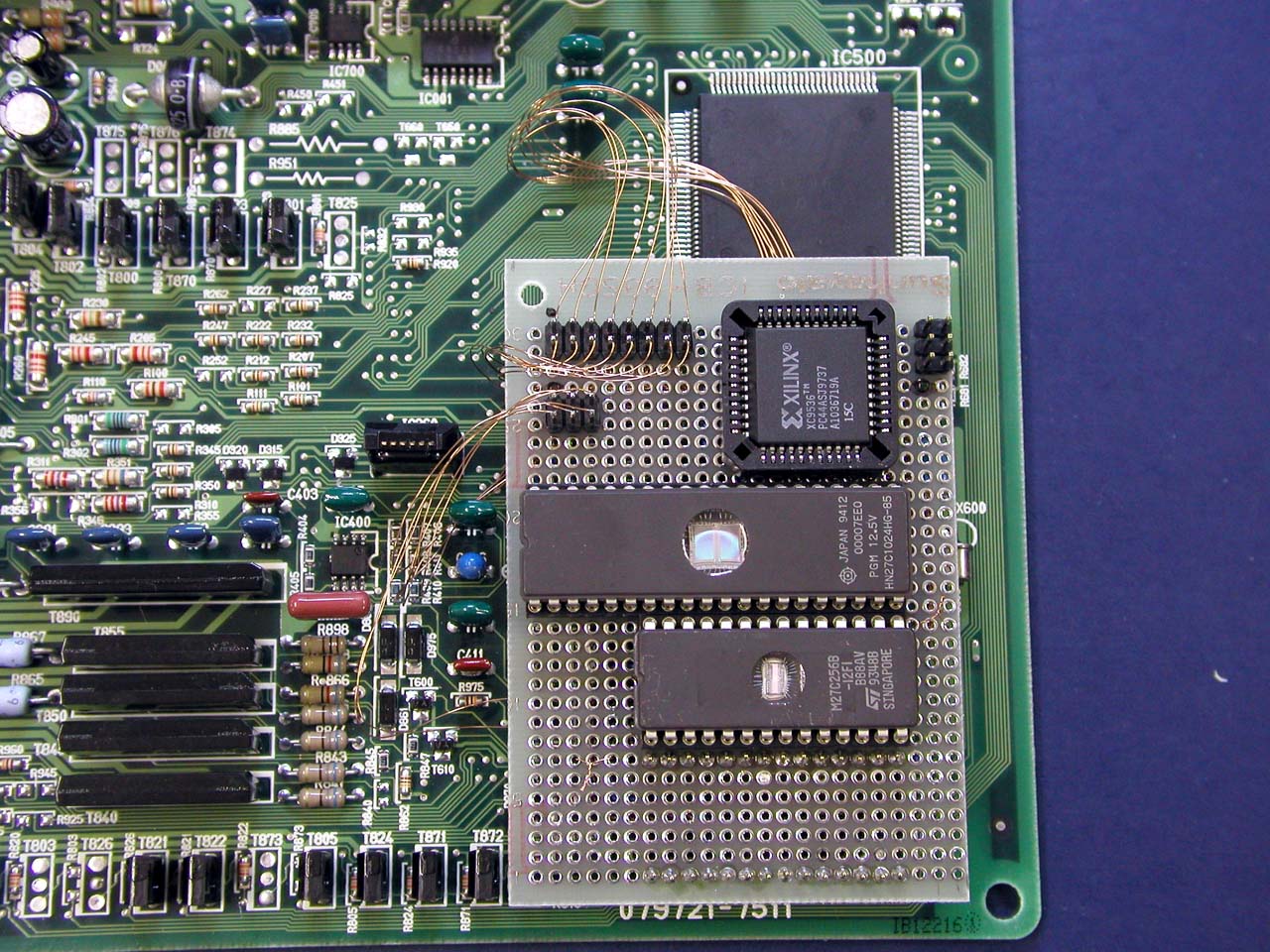 ![]() メイン基板との接続。QFPの足を跳ね上げて、基板側ピン側それぞれから配線を取り出す。 |