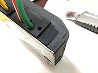 部品の右下の部分がフレームに干渉するので、カッターで削っておく。 |