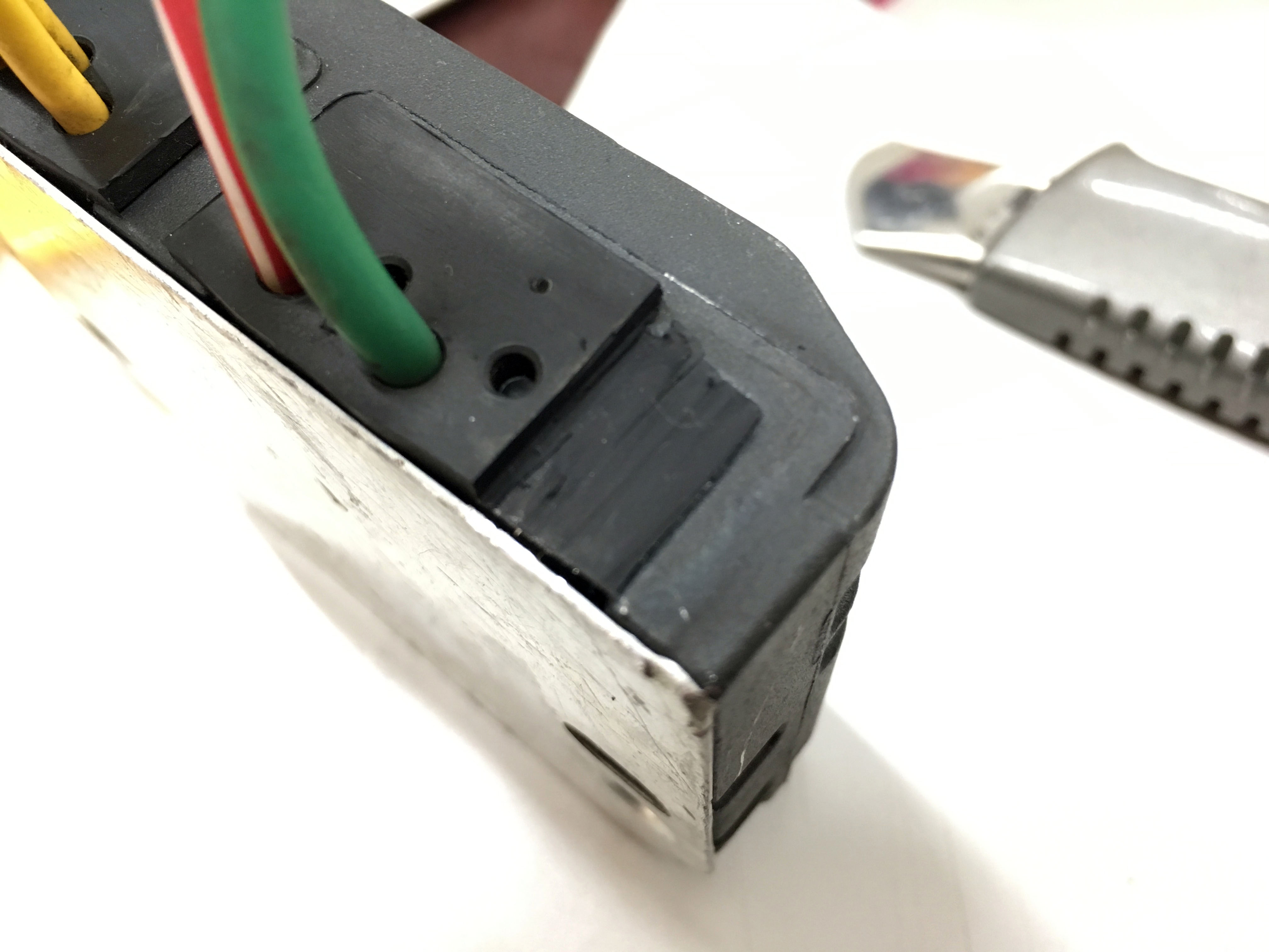 ネジの噛みが薄いのが気になったので、取り付け穴の廻りをフライス加工してみた。 でも、そのまま加工無しでも問題なし。 フライスで 6mmくらい掘ったら、中の充填剤が出てしまった。 真似して削る場合は、表面の厚さが 3mm程なので 2.5mmくらいにしておいた方が良い。 |