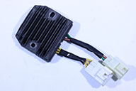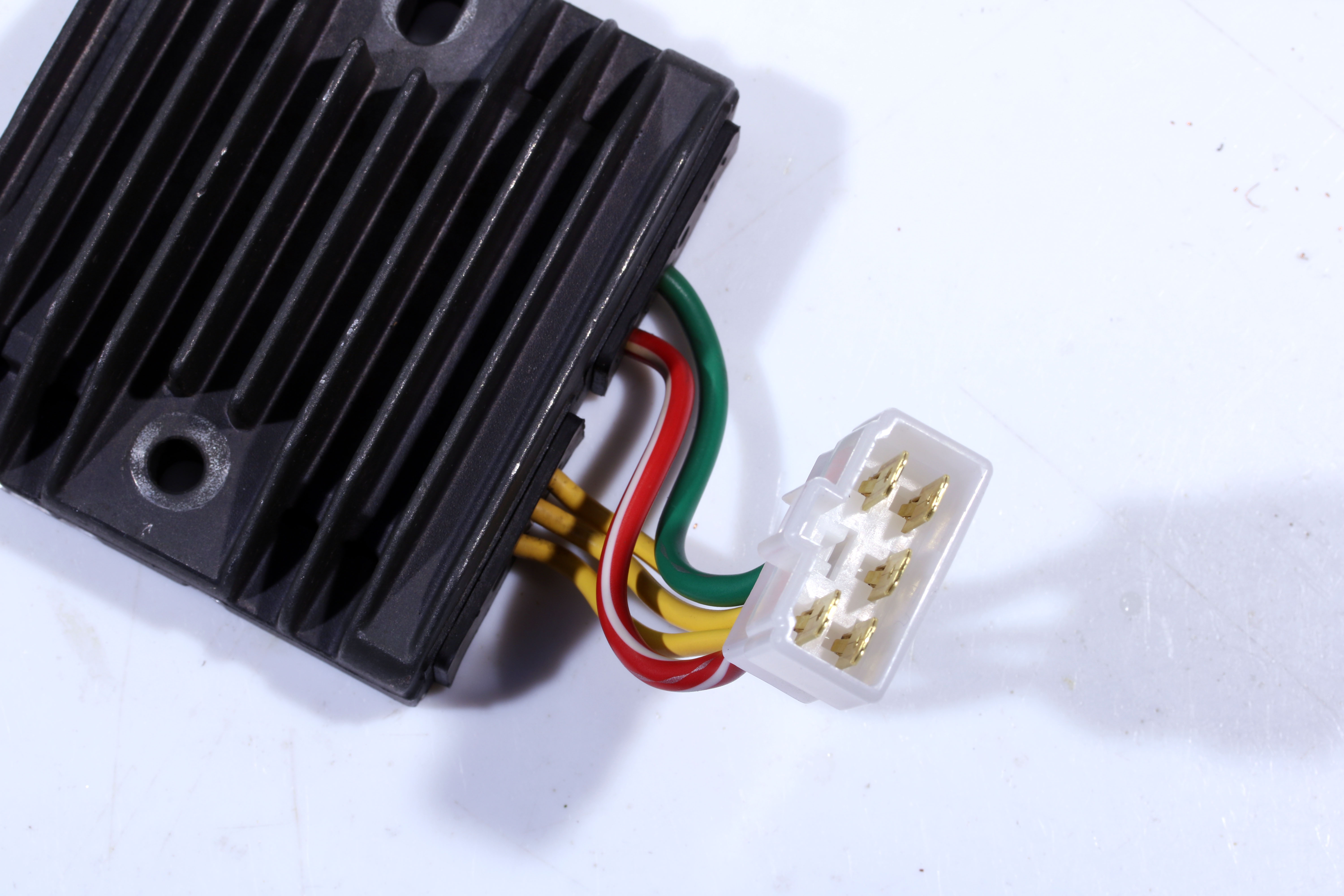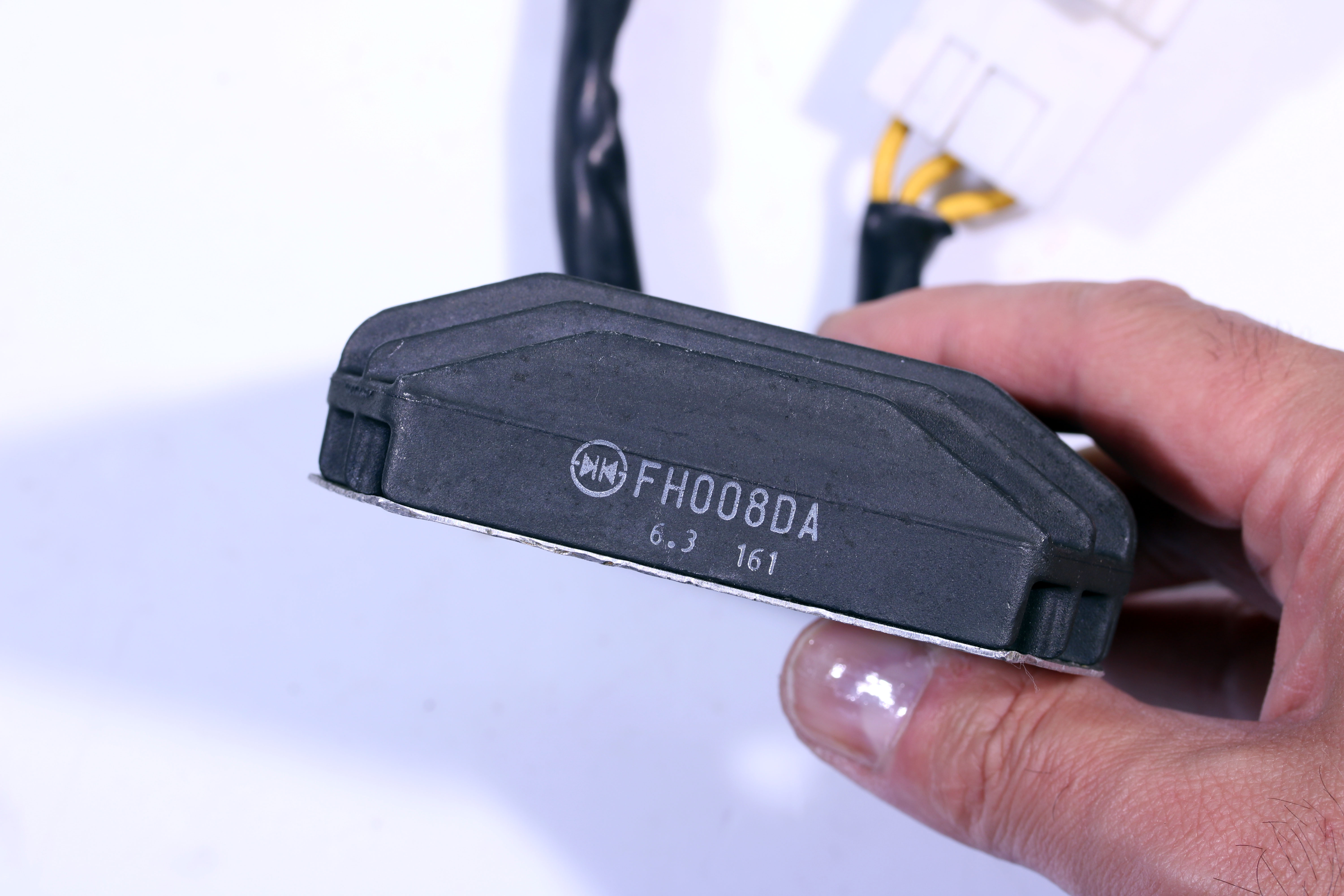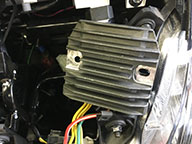 バイク用のレギュレーターはオルタネーターのワット数やバイクの系列で共用である場合が多く、寸法と変換型が合えば流用が可能だ。大きく分けて単相(2+2本)、三相(3+2本)、三相+フィールドコイルタイプ(5+2本)があって、他車のものでも配線を組み換えて使う事ができる。