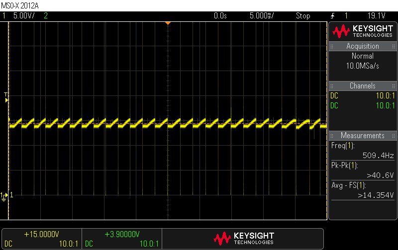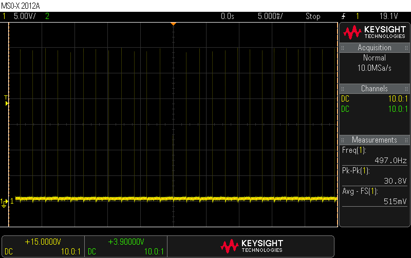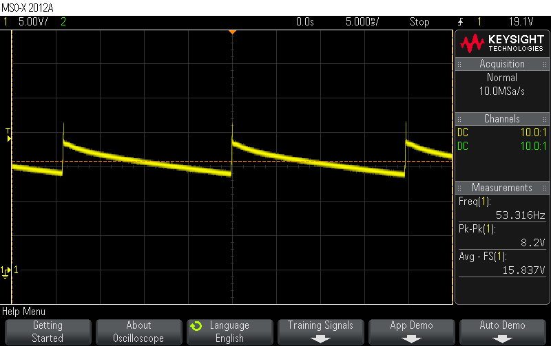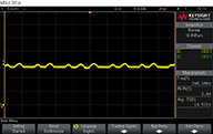 無負荷(バッテリーで平滑されていない)のレギュレーター波形。 怪しいスパイクノイズは無い。 |
