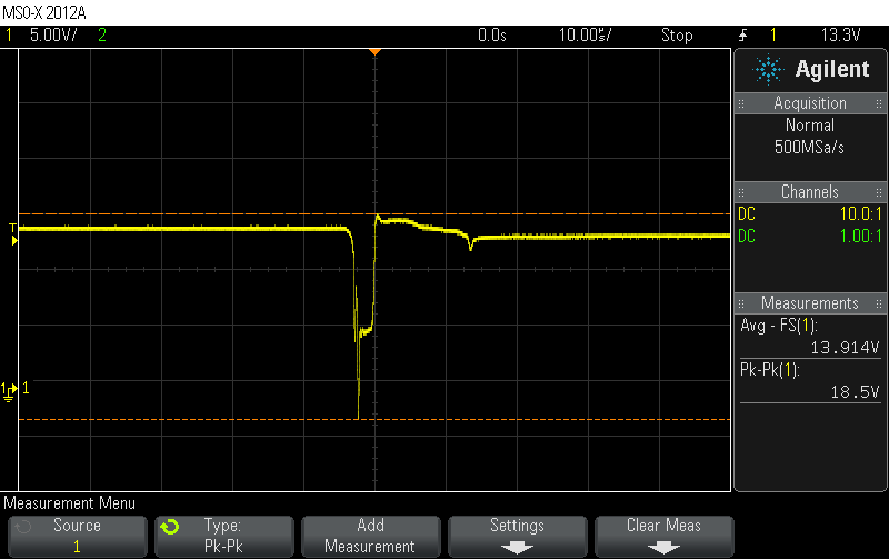ちなみに、SMAX純正レギュレータの無負荷波形。 エンジン半回転(?)に分けて電圧監視 <-> 充電を繰り返しているのか不明だが、バッテリーが付いていないと起電しない。でもってスパイクノイズだらけ。 |