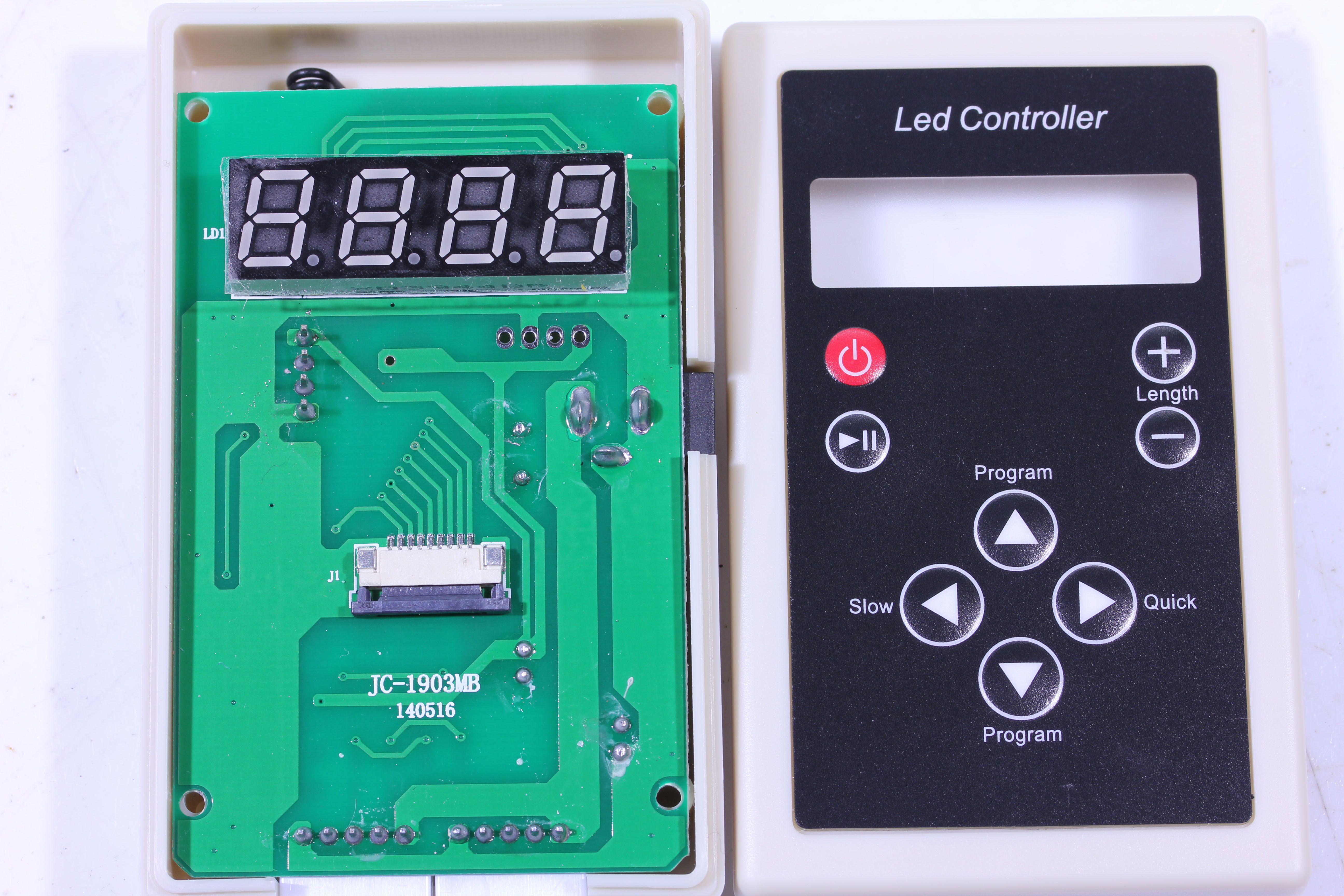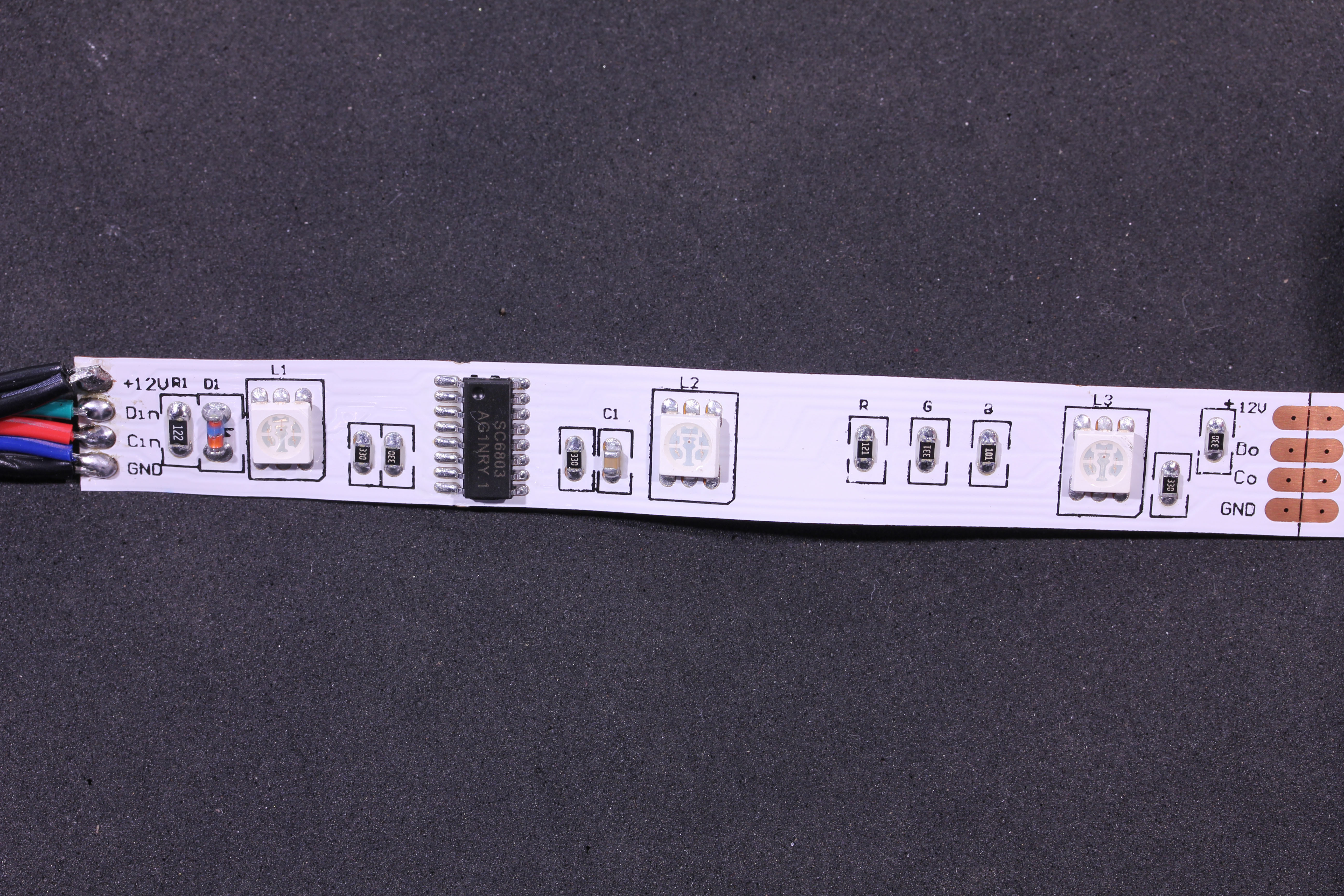 ・Super流れるLED流れるテープLEDには何種類か系列があって、これは 123パターンできますの白い箱のコントローラーが付いているタイプだ。もー中身がどーなってるのかどーでも良い感じだが、このシリーズのやつは、LEDが3つで1グループになっていて 1つづでは LEDをコントロールできない。 テープのLEDドライバはSC6803とかいう同期シリアルレシーバーが付いていた。