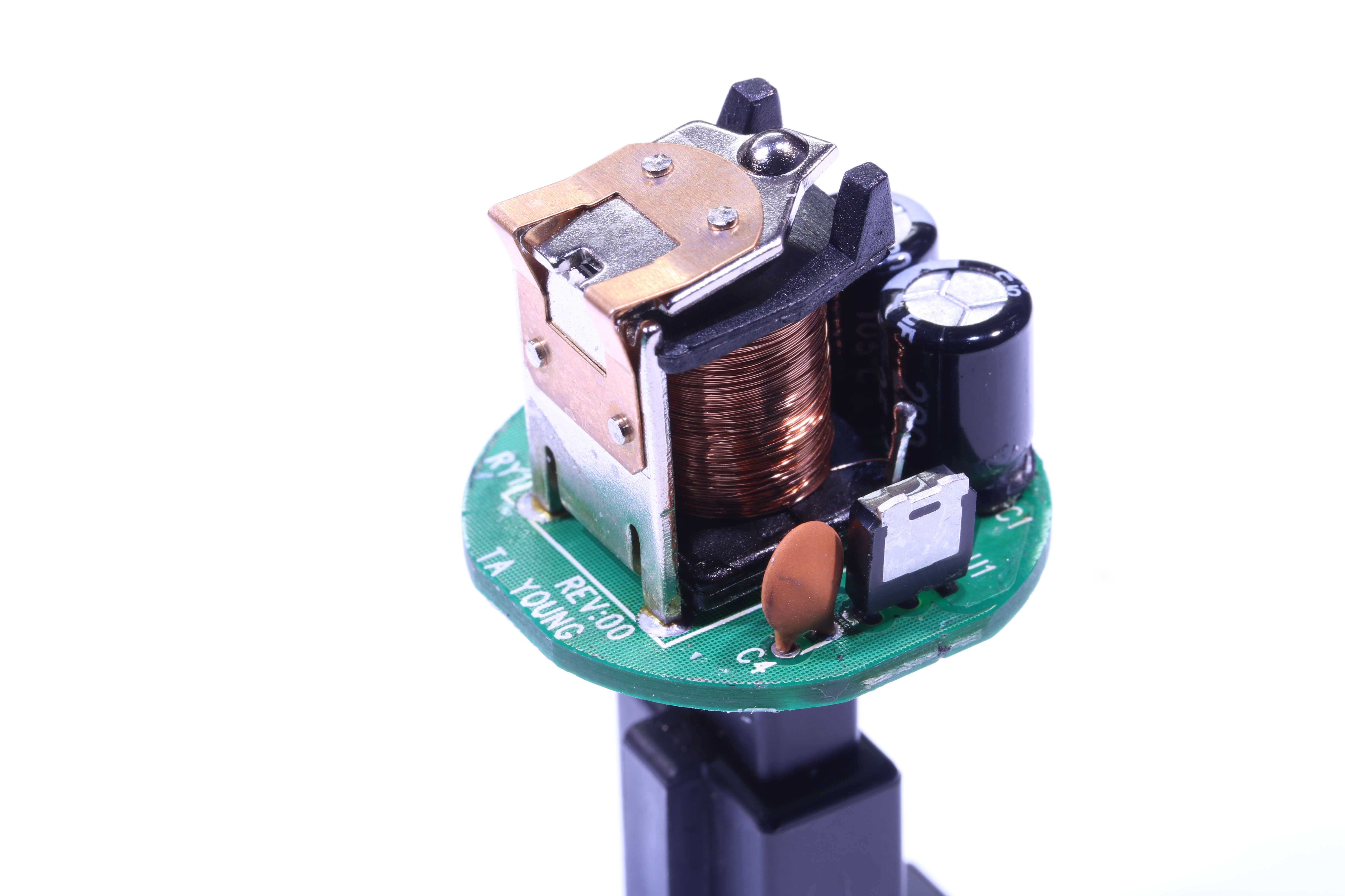 ・ヤマハ純正 3ピン ウインカーリレー球切れ電流のしきい値も点滅周波数も変更不可の専用IC(STM VN1160)ワンチップ構成でリレーのように見える部品は、カチカチ音を出すためのソレノイドである。電流のしきい値は変更不可なので、フタを開けてちょっと改造してLED化対応なんてことはできない。