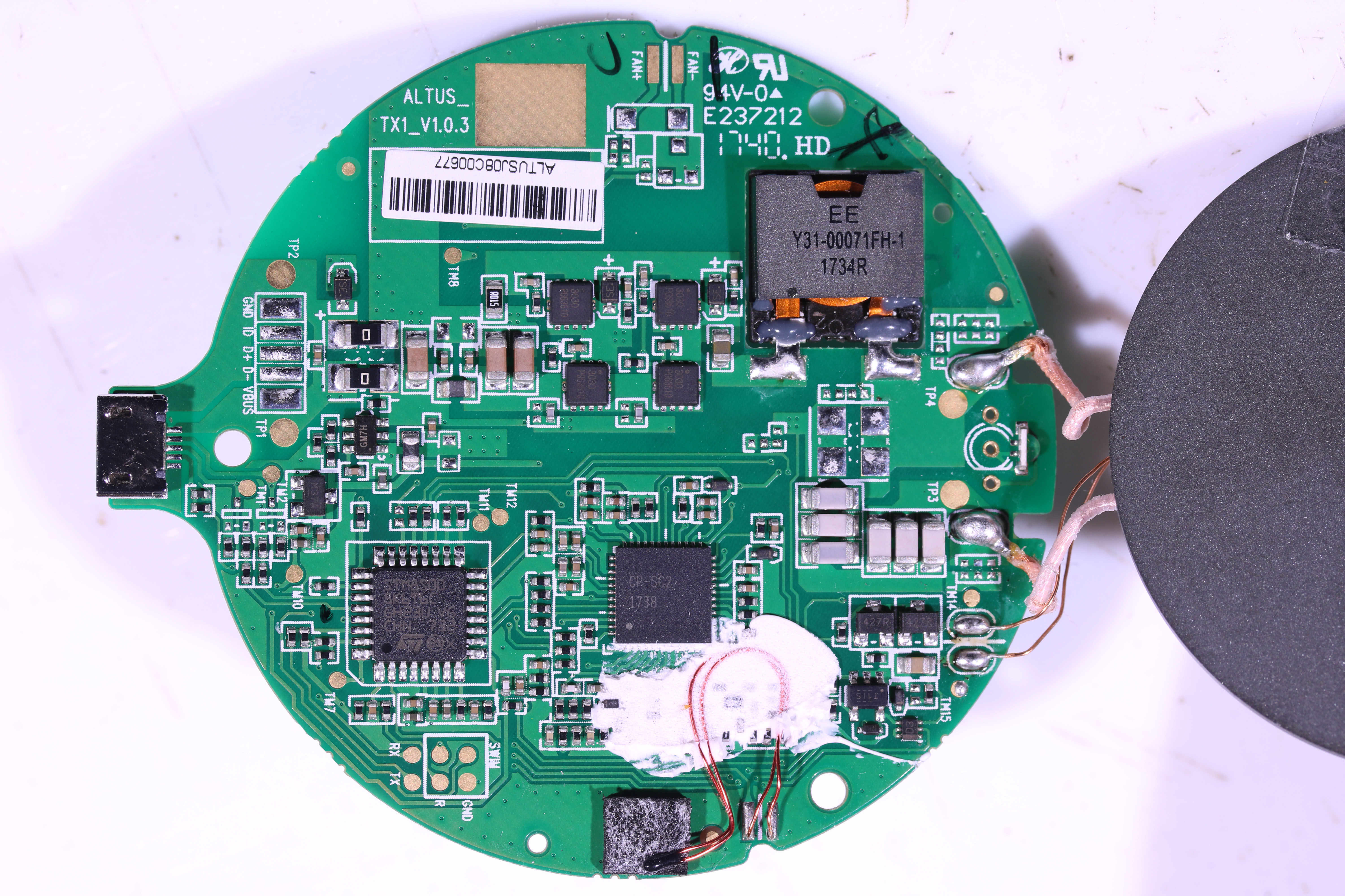 ・Omars WC15BK ワイヤレス充電器マイコンが STM8S005C6、真ん中の CP-SC2というアナログチップは Convenient Powerという会社のDC/DC制御チップだ。WPCプロトコルをしゃべる専用チップを使わないで、マイコン+DC/DC構成で作ったチカラ技回路だな。