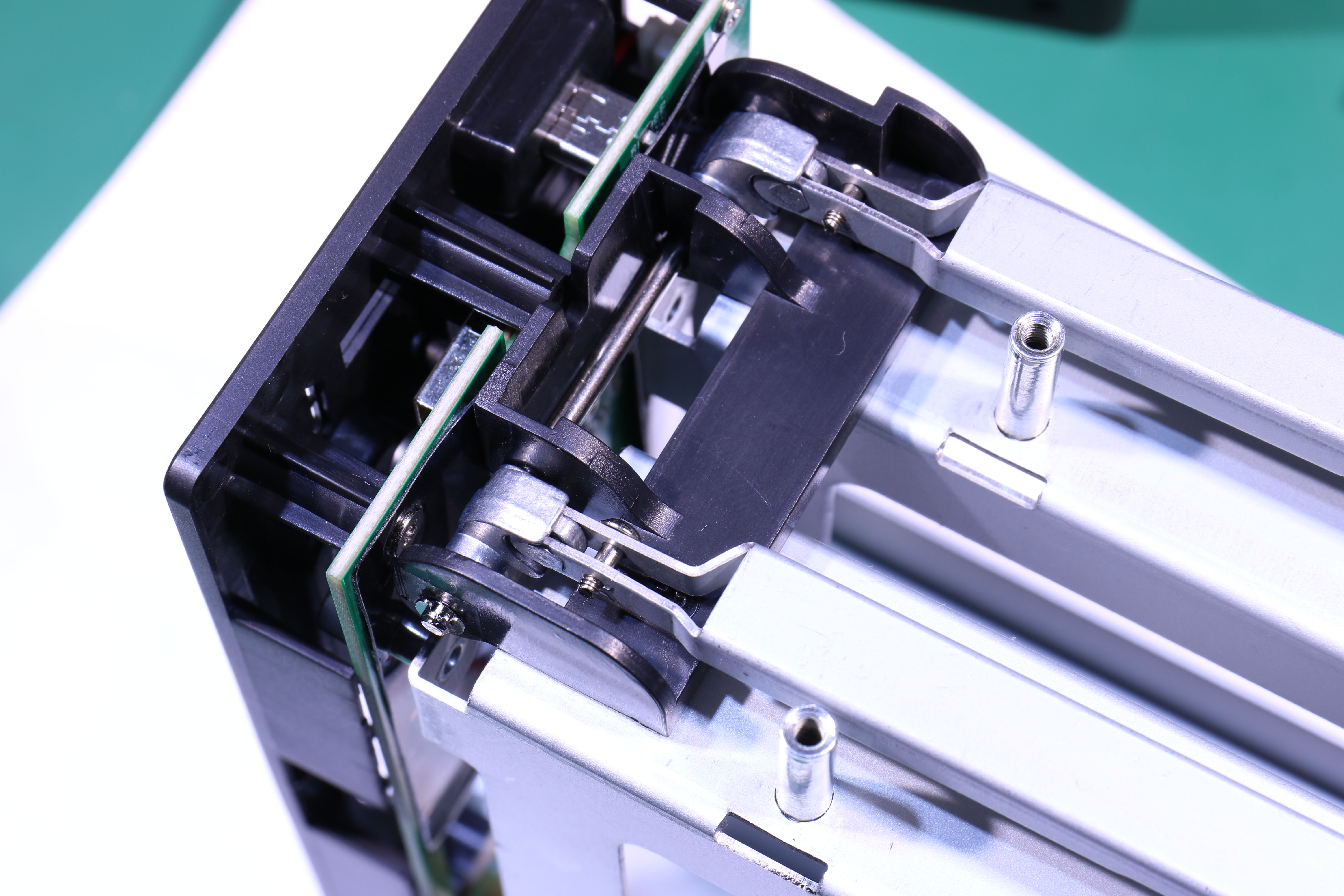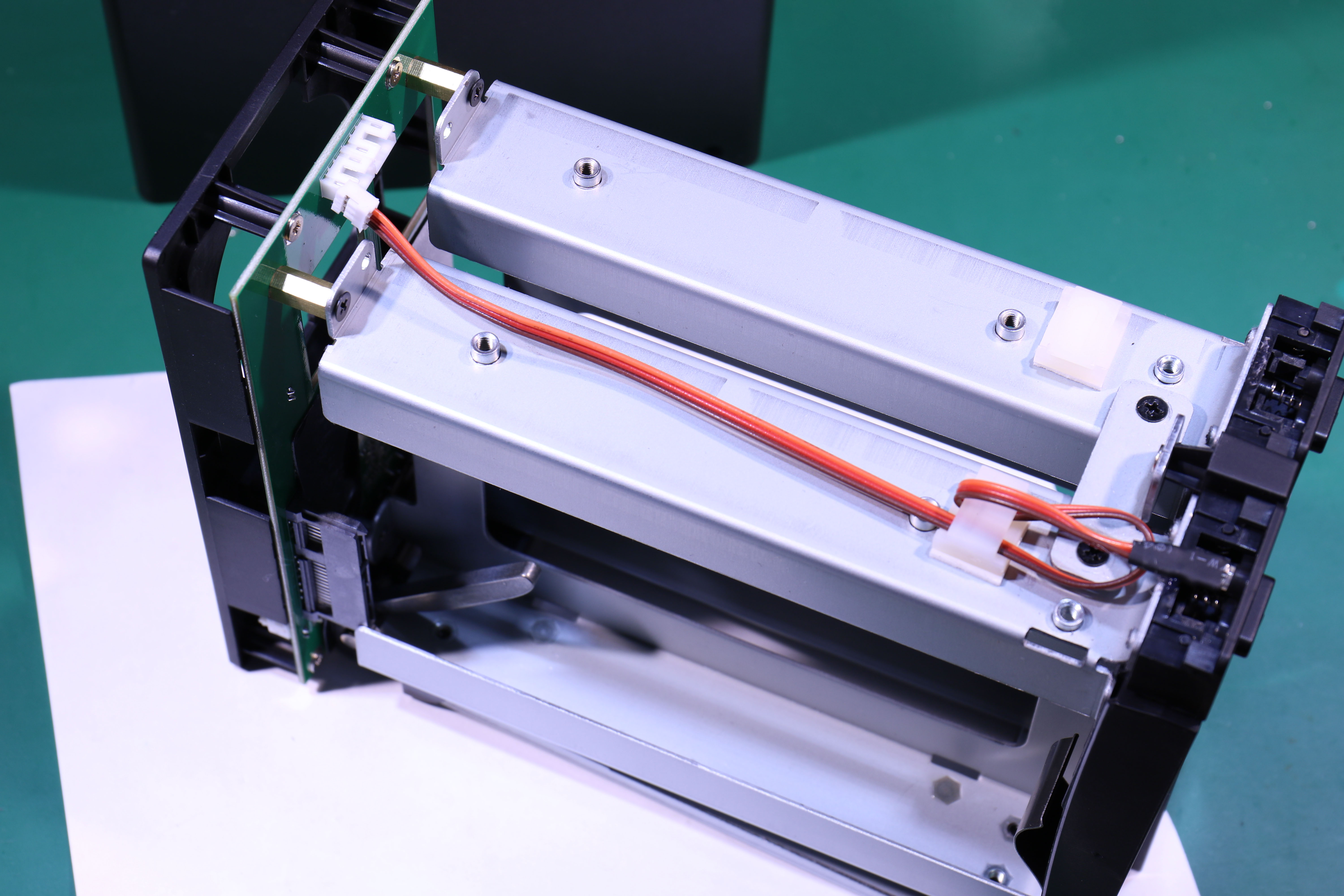 フタを開けると、中でHDDの背後に延びたアームがHDDを押出す仕掛けになって