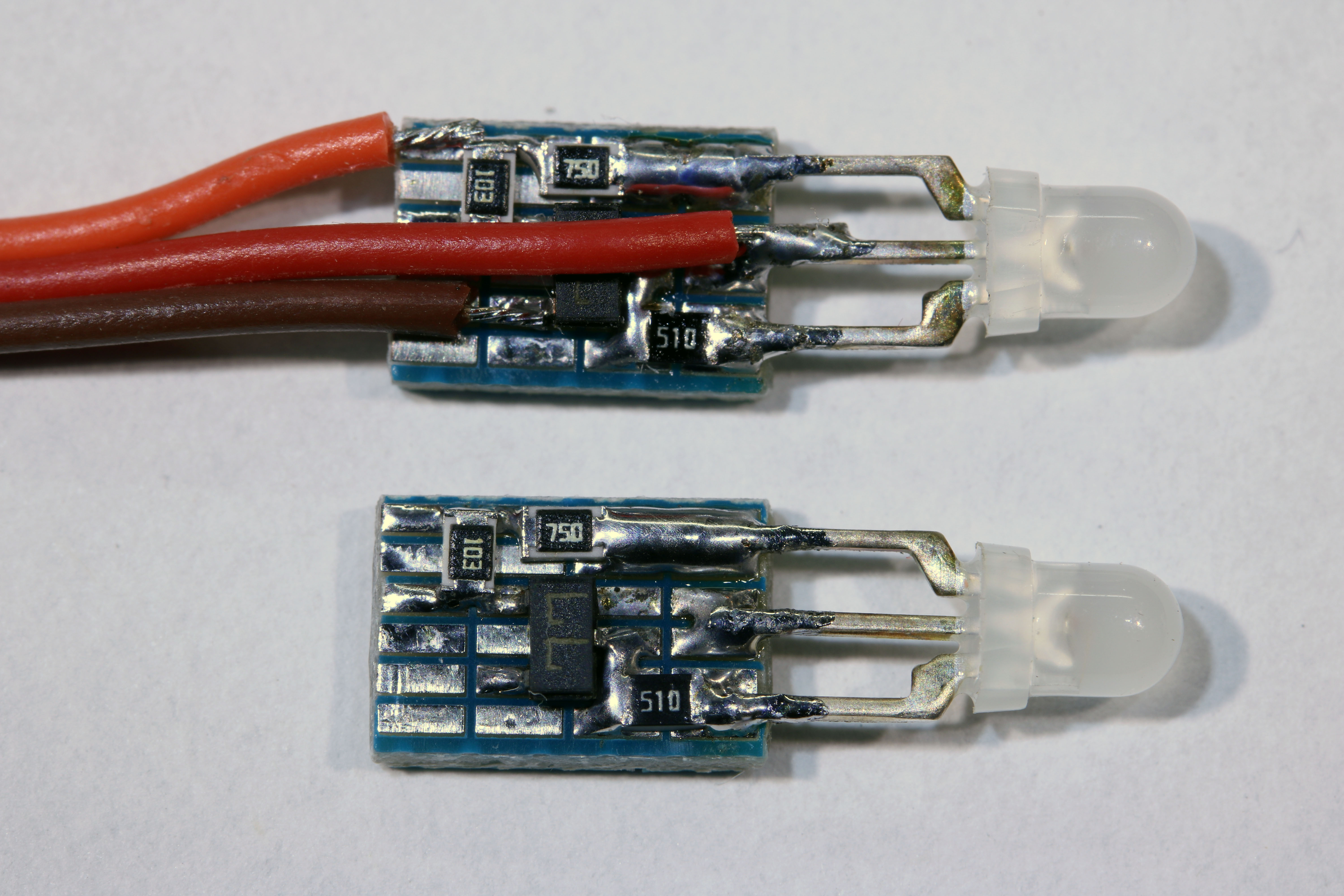 2色LEDが同時に光って気味悪いので排他回路も付けてみた。