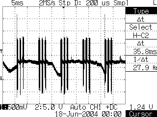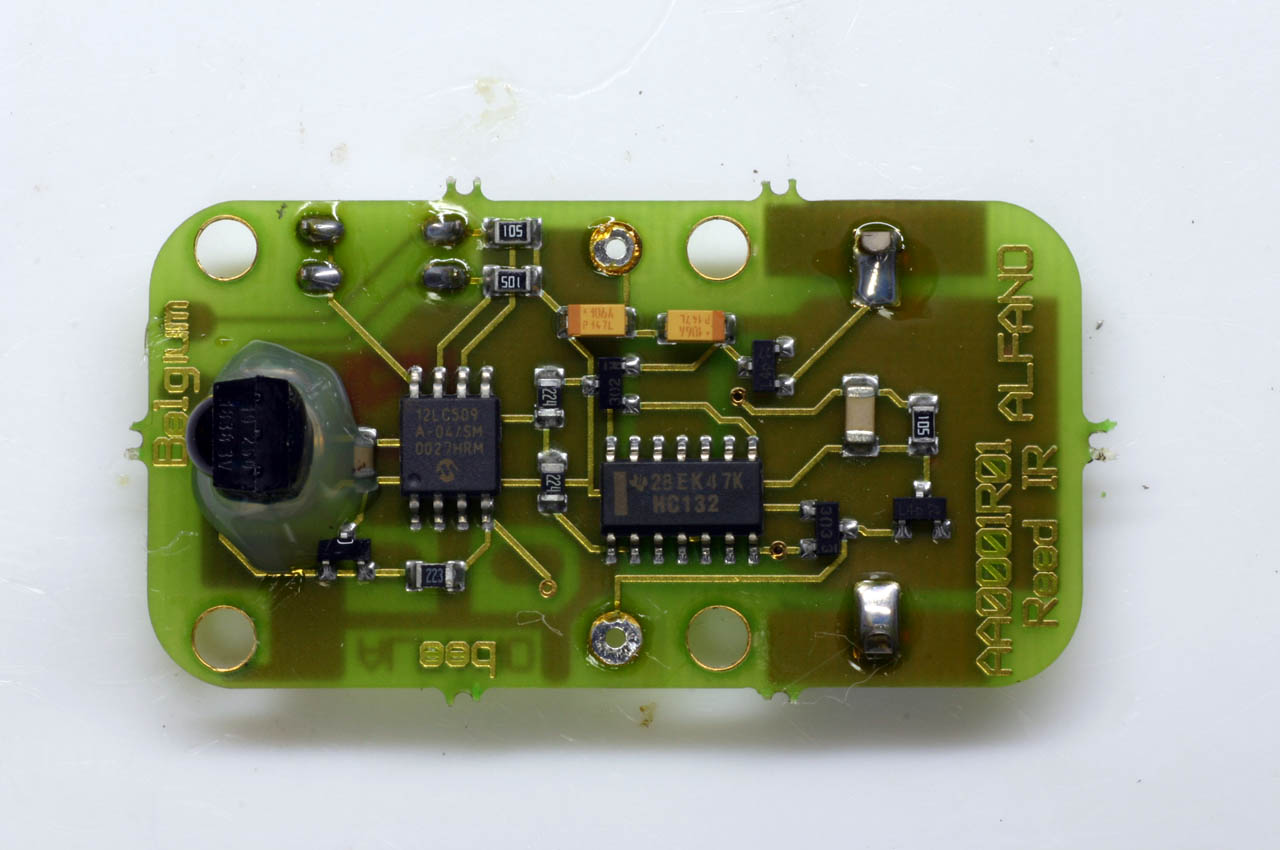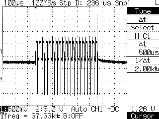 ALFANO LAPタイマーの赤外線センサーとトランスミッタである。送信機のLEDが1つなので、道幅のあるサーキットだと厳しいかも知れないが作りは割としっかりしている。 カート用だけにカートに踏まれても壊れなさそうな感じだ。一応なんちゃってIDモジュレーションがかかってるみたいで、このトランスミッタの場合は、37KHzキャリアで 500usパルスが3回ずつ 9msおきに出力されていた。