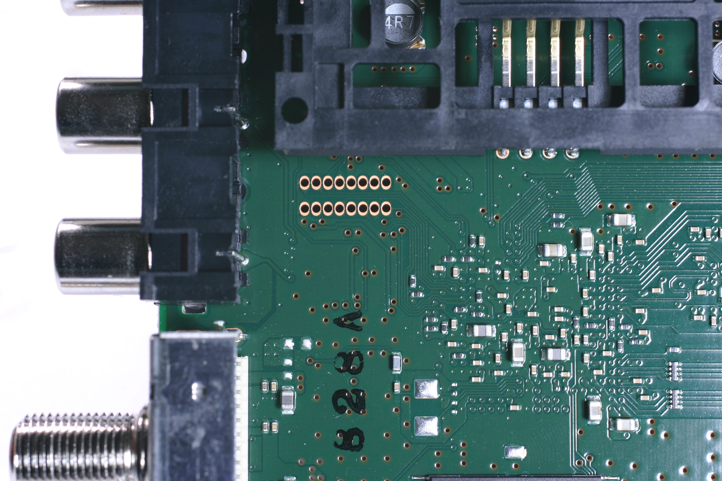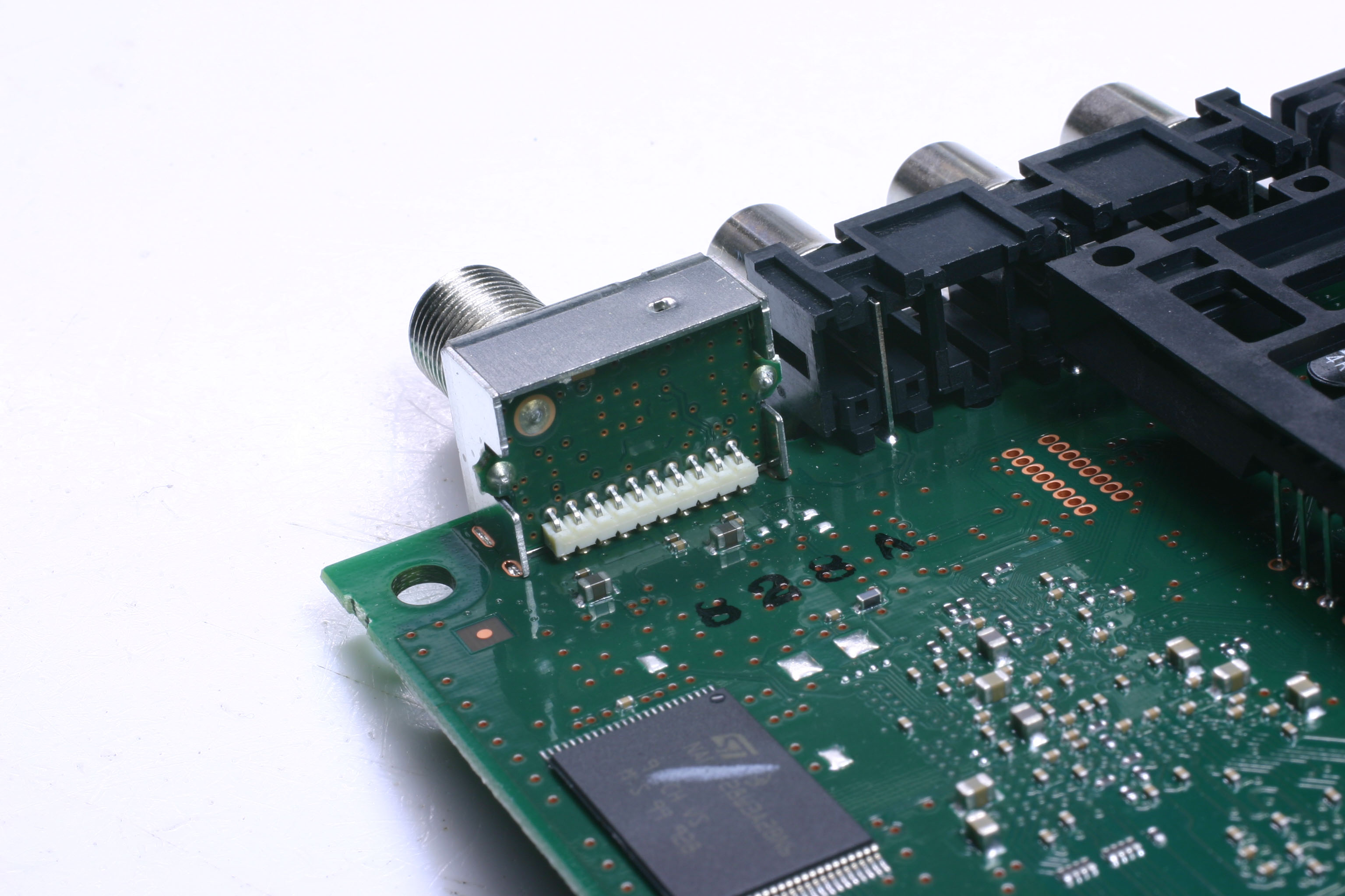 ・AEONの5,000円地デジチューナーチューナーモジュールがコネクタの根元に凝縮されている。 NECのカスタムワンチップで、中身何だか判らず。 V850のIPとか入ってるのだろか?中に拡張コネクタらしきものがあるが、HDMIや色信号が出ていたとしてもメニューから画面モードが480iから変更できないので、S-Videoくらいしか使えないかも。 これじゃネタにならんわ。