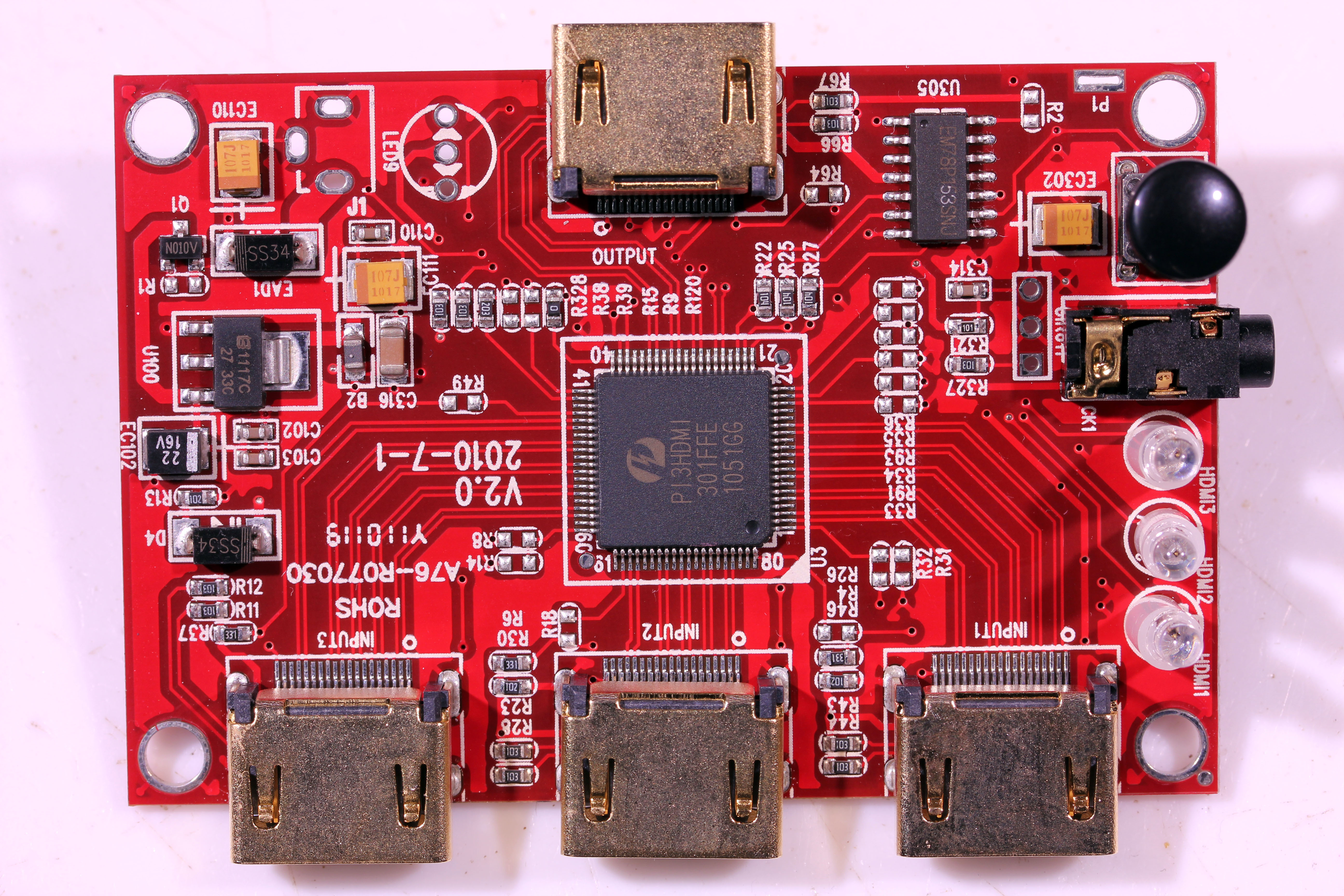 ・HDMI切替器 GREENHOUSE GH-HSW301IN1~3機器の電源ON連動でTVは反応OK。 TV側からの電源ON連動では、最後の選択がIN1以外でもIN1に繋げた機器がONになる。まー、こんなもんか。右上のEM78P153Sがマイコンだな。