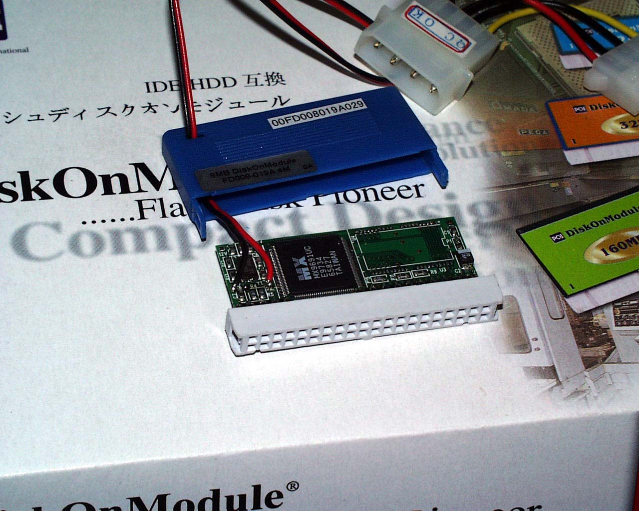 なーんて事を言いながら、DOM(DiskOnModule)という既製品を買ってしまった。 IDE-HDD互換のフラッシュメモリで、8MBのやつが7,500円だった。 取り付けは、マザー上のIDEコネクタに直接挿して、電源コネクタを接続するだけだ。 もちろん、ブートもできる。