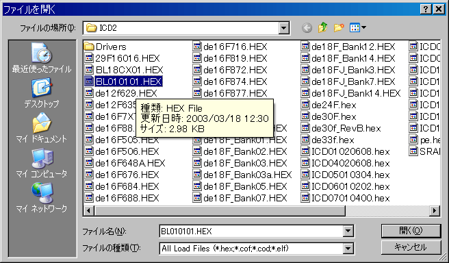 MPLAB IDEをPCにインストールすると、フォルダ C:\Program Files\Microchip\MPLAB IDE\ICD2\が作成されるのでその中の BL010101.HEXを PIC16F877に書き込めばOKである。 ちなみに、MPLABとPICSTARTで既存HEXを書き込むには、File→ImportでHEXファイルを取り込んで書き込めば良い。
