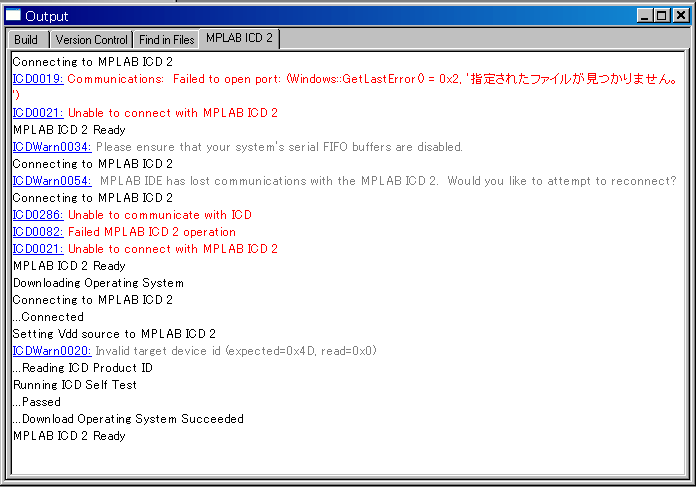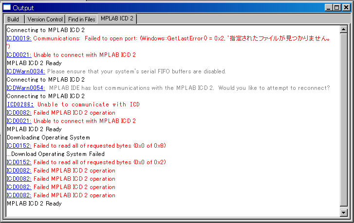 PCのCOM1に接続して、MPLABを起動する。 Programmer→Select Programmerで ICD2を選択すると、USBで接続しようとして失敗するので、SettingメニューからCommunicationタブで接続をCOM1 57,600bpsに設定する。 この操作は、ICD2の通信ポート設定がデフォルトで USBとなっているので、使用する度に毎回する必要がある。