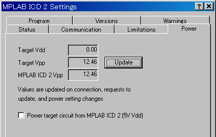 Programmer→Setting→Powerタブを開くと、ICD2のA/D入力で Vpp電圧のチェックができる。 おおよそ 12.5Vを示していれば問題ない。 ターゲットへの電圧供給チェックを入れたり切ったりしてターゲットVddの数値が 5V, 0Vになるかも確認しよう。
