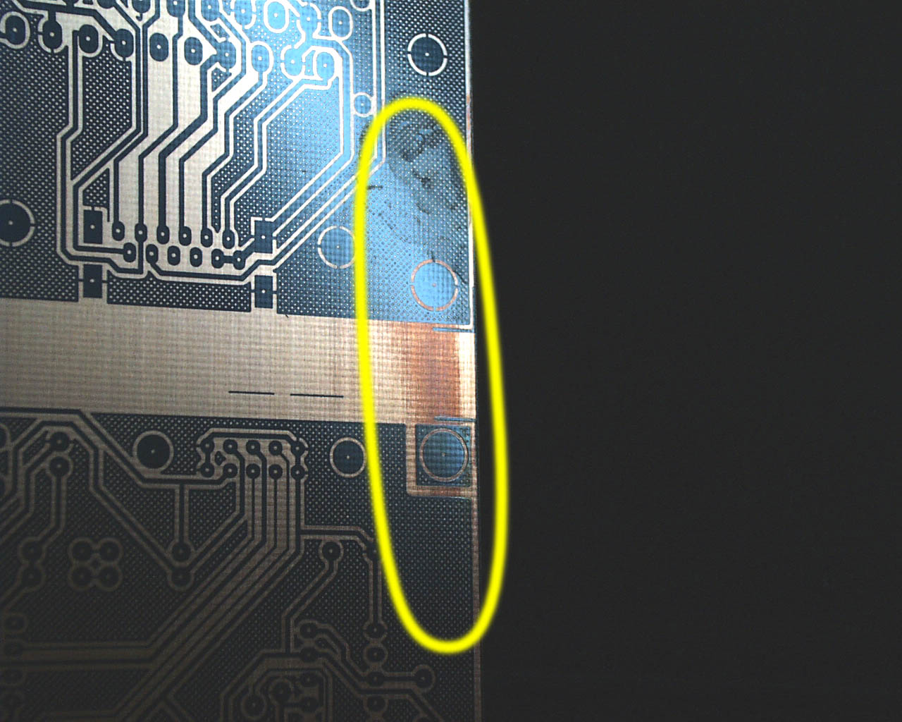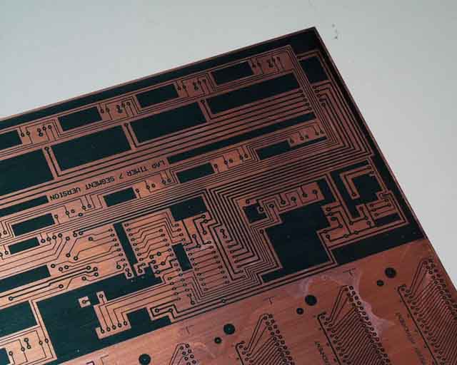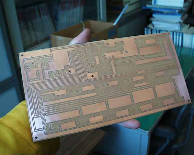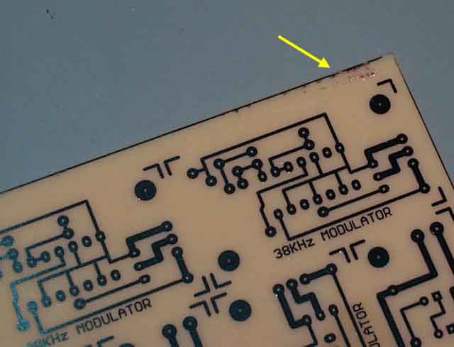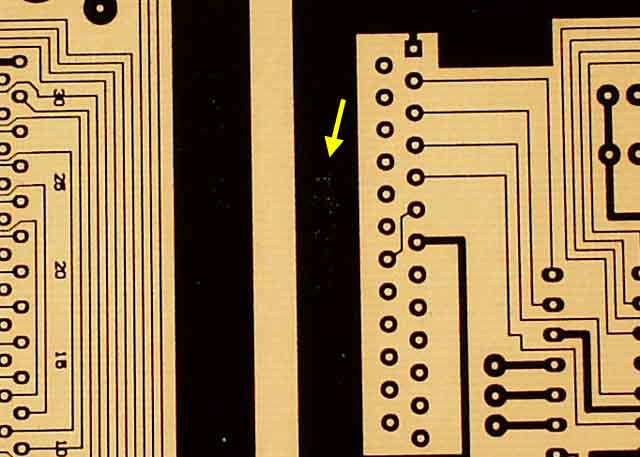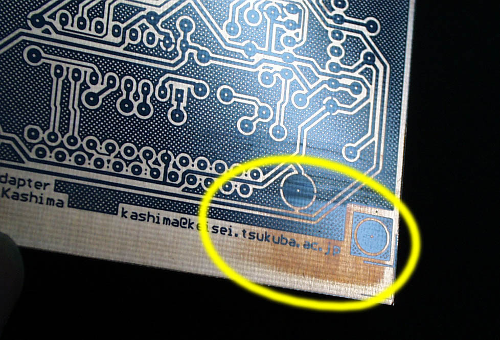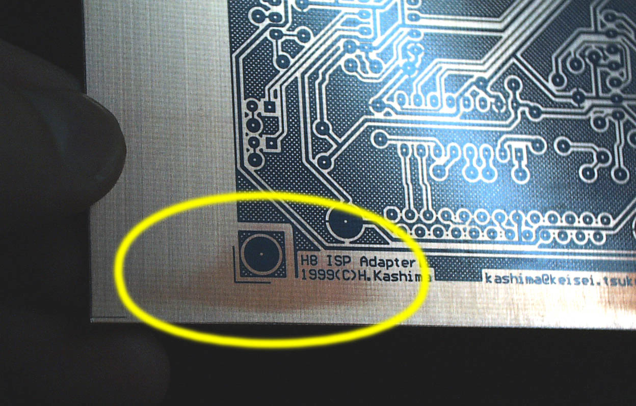 包装と基板本体との間にたまる空気の層が原因か、はたまた製造過程の問題か、原因は分かりませんが、エッチングしてからパターンを削るよりは、上の方法で処置した方がはるかに楽なので、注意して検査しましょう。 また、くれぐれも現像液の温度を適正(約30℃)に保ちましょう。