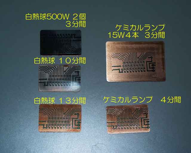 初めて露光をする時や、ランプの種類を変えたときは露光時間試験をすることをお勧めします。 サンハヤトから露光テスト用の感光基板 TEST-Kが販売されているので、それを使いましょう。