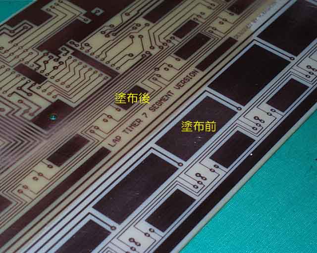 店での保存状態や基板そのものの品質のばらつきによって、現像しても感光膜がうっすら残る事があります。 現像後、光に照らして良く見ると判ります。 不幸にして感光不良のエリアができてしまった場合は、有機溶剤をティッシュペーパーに付け、余分な膜が取れるまで表面を溶解します。 溶解した後は、現像液で軽くこすり、その後水洗いします。