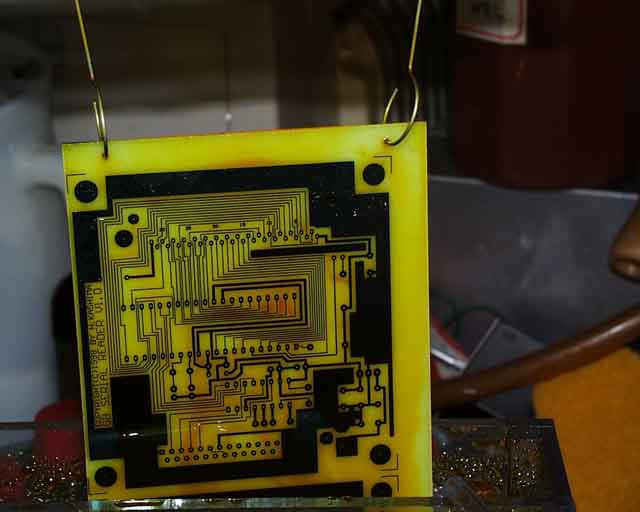 (※追記)5分半を越えると、感光皮膜の切れ目から浸食が始まります。 5分経ったら一度目視してみて、エッチングむらがあまりにあるようであれば、局部的にエッチングするなどして処理する必要があります。